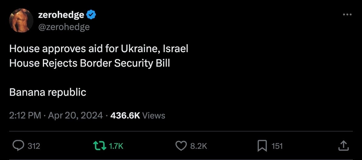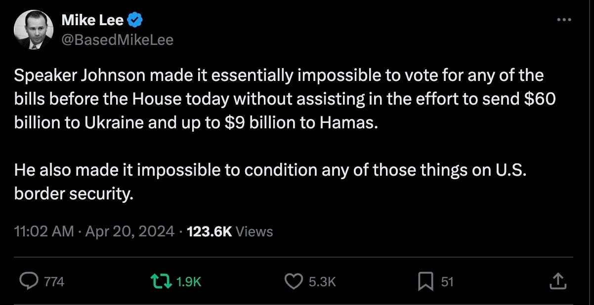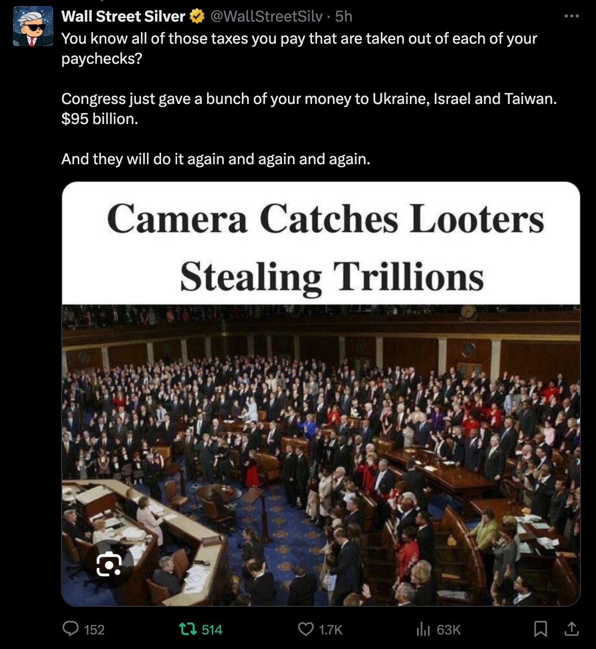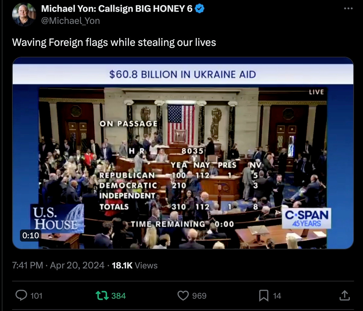 The wholly captured, blackmailed and bribed House passed a collection of unconstitutional bills yesterday giving away $95 billion in money stolen via taxes to Ukraine, Israel and Taiwan.