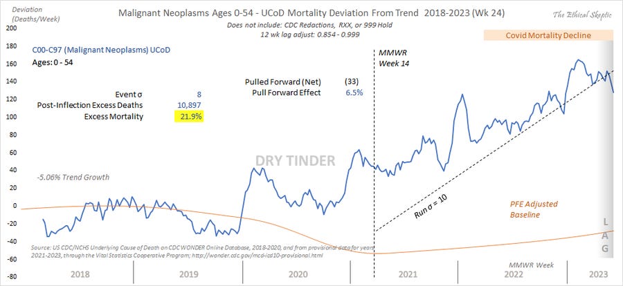 Yesterday this Substack reviewed the latest cardiac mortality data: A few days before that, this Substack reviewed the latest cancer data: Today we tie these terrifying trends together by reviewing the latest data on excess non-PSYOP-19 natural cause mortality: