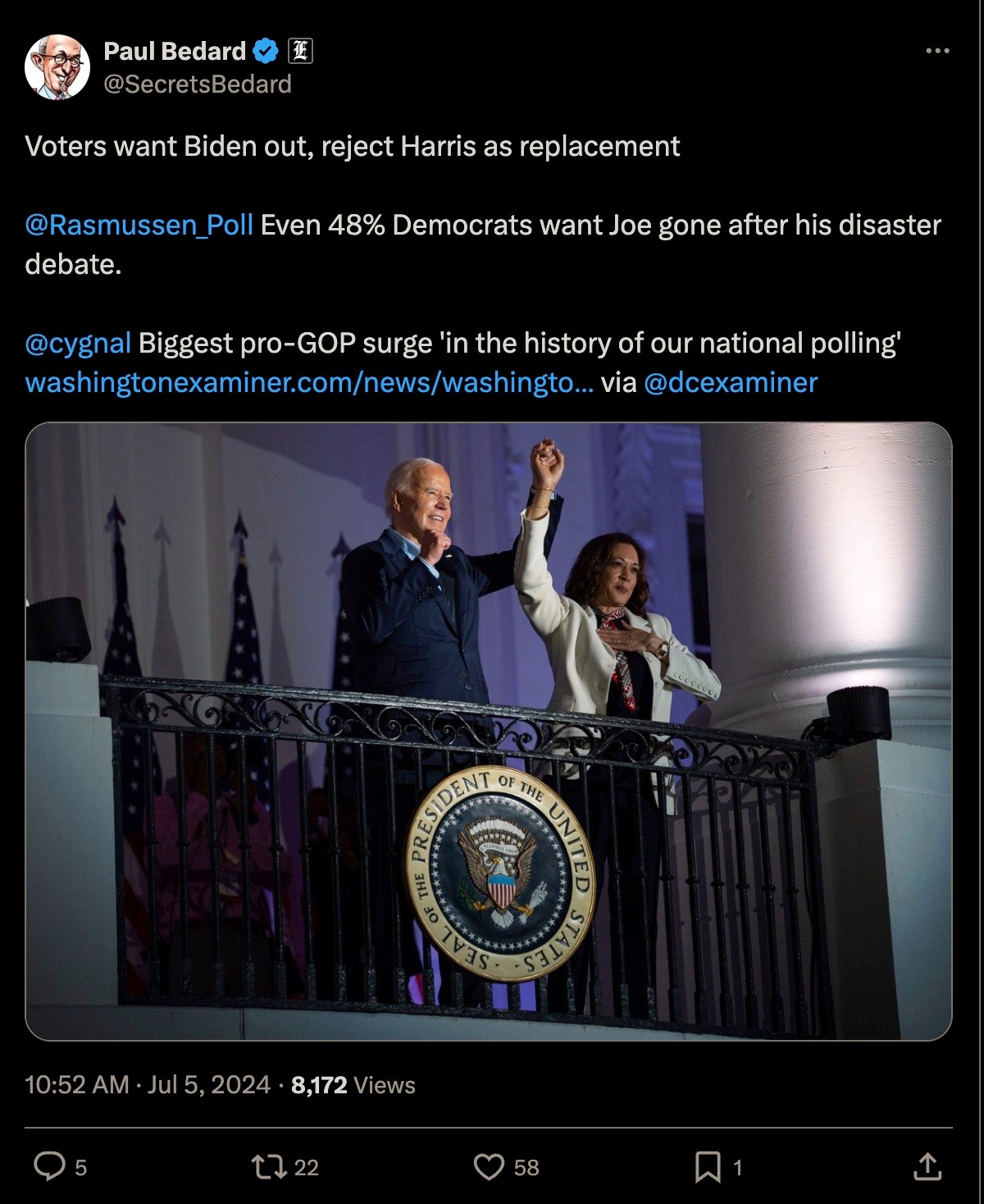 A Harris poll has revealed that if the Democratic Party decided to make Kamala Harris the nominee, fewer people would vote for her than they would cognitively impaired Biden against Trump.