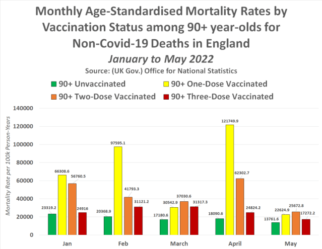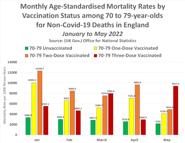 These are age-standardised figures. There is no other conclusion that can be found for the fact mortality rates per 100,000 are the lowest among the unvaccinated other than that the Covid-19 injections are killing people. Which makes the fact that 1 in every 73 Covid-19 vaccinated people were dead by May 2022 in England all the more horrifying.