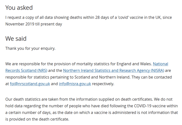 For months on end, UK Government institutions insisted that they did not hold any data on deaths by vaccination status. Each and every single time a Freedom of Information request was made, the response received was as follows –