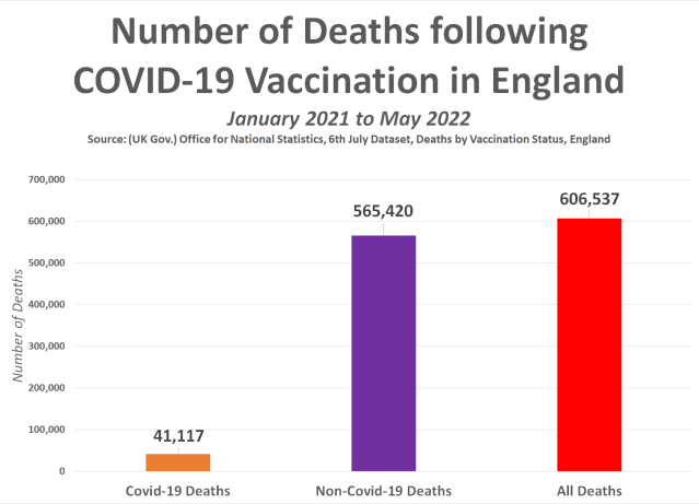 According to the Office for National Statistics between 1st Jan 21 and 31st May 22, a total of 41,117 people died with Covid-19 following Covid-19 vaccination, and a total of 565,420 people died of any other cause following Covid-19 vaccination. This means that in all, 606,537 people sadly died by 31st May 2022 following Covid-19 vaccination.