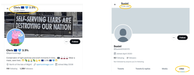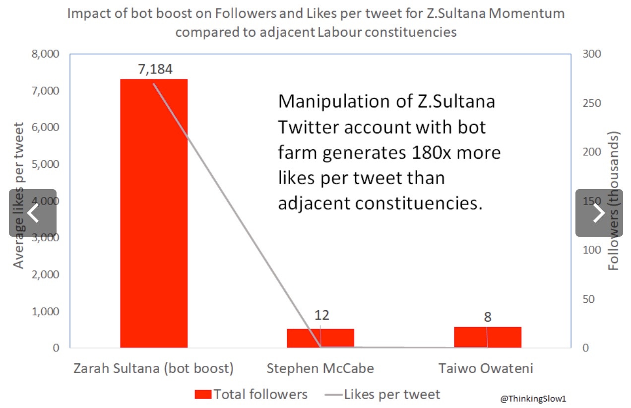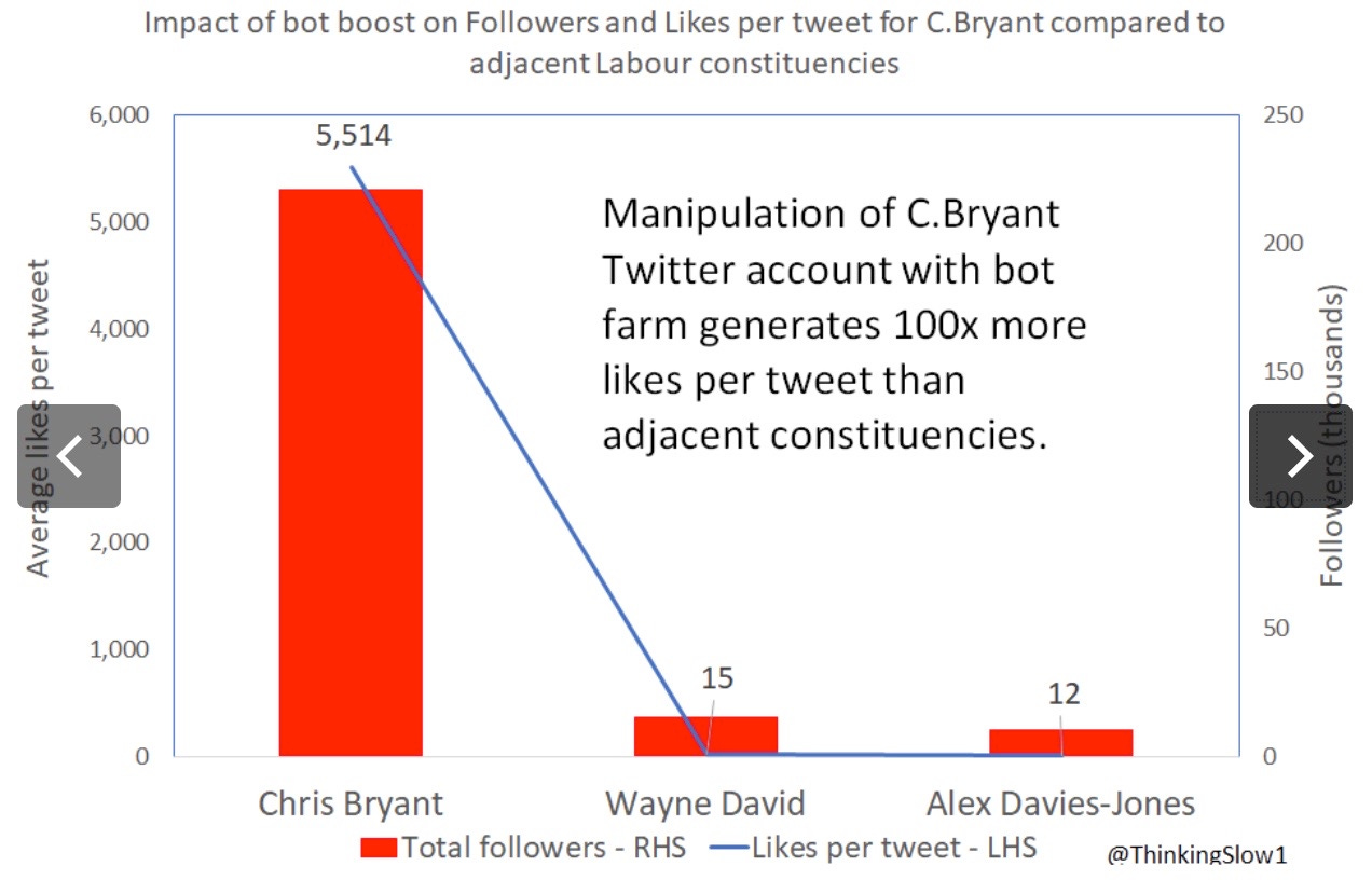 The tweets of these MPs receive something in the region of 5,000 likes per tweet as compared to well-known UK journalists and academics receiving not more than 400 likes per tweet. The level of 5,000 likes per tweet is around 180x higher than other MPs in adjacent constituencies; such anomalies point to automated amplification, ThinkingSlow stated.