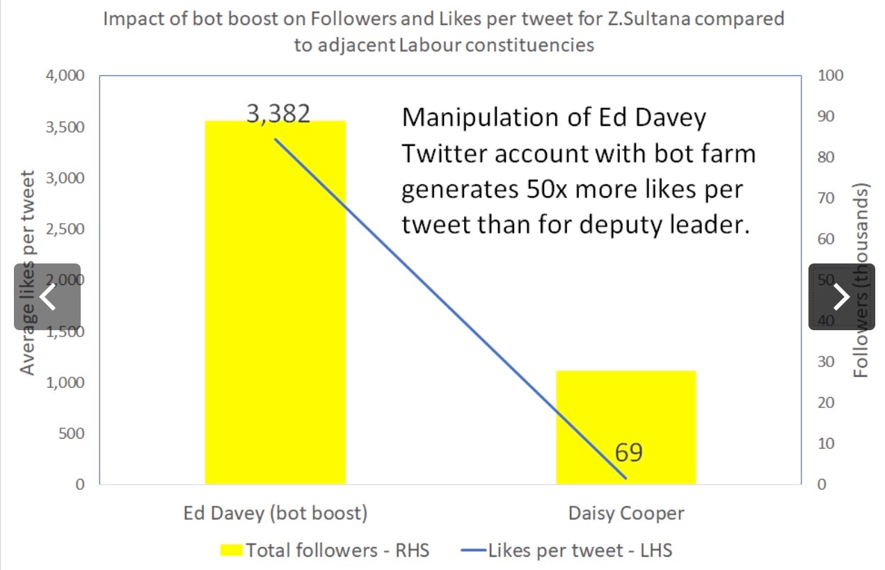 By benchmarking three MPs against their nearest peers (see images below), ThinkingSlow demonstrated the magnitude to which these bots amplify messages. Please note the third image should be titled “Impact on bot boost Followers and Likes per tweet for Ed Davey compared to adjacent Liberal Democrat constituencies.”
