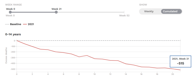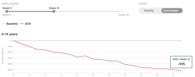 From week 44 of 2018 to week 21 of 2021, 735 fewer deaths occurred among children aged 0 to 14 than expected.