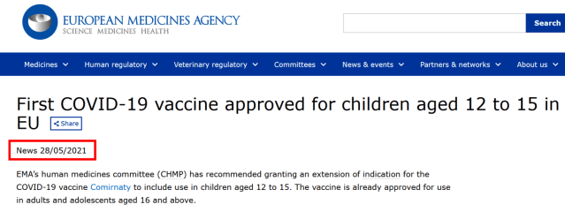 The European Medicines Agency (EMA) had finally granted emergency use approval for the use of the Pfizer COVID-19 vaccine in children aged 12 to 15.