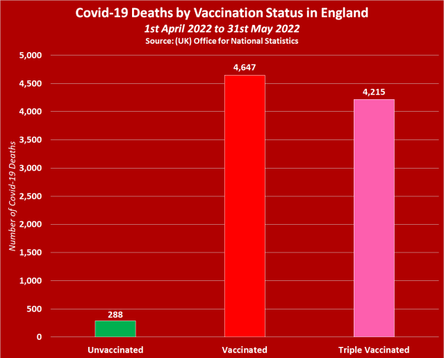 In all, according to the ONS, there were 4,935 Covid-19 deaths over these two months, and the vaccinated population accounted for a shocking 4,647 of those deaths. But what’s even more shocking is that the triple vaccinated accounted for 4,216 of those deaths, with just 288 deaths recorded among the unvaccinated population.