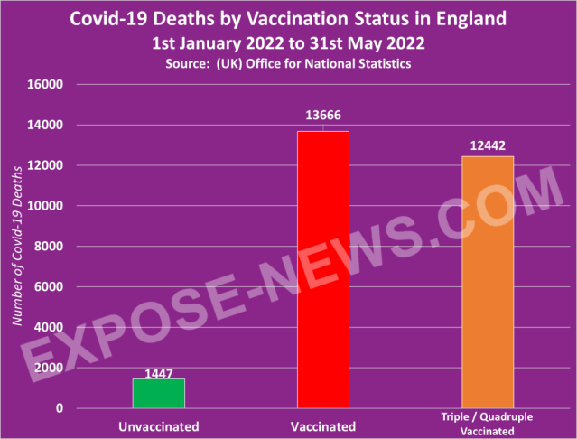 The following chart shows Covid-19 deaths by vaccination status in England between 1st January and 31st May 2022 –