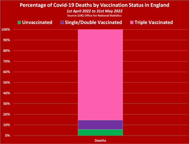 Official figures published by the UK Government reveal the fully/triple vaccinated population have accounted for over 9 in every 10 Covid-19 deaths in England over the past year, 91% of all Covid-19 deaths since the beginning of 2022, and 94% of all Covid-19 deaths since the beginning of April 2022.