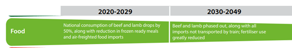 To do this national consumption of beef and lamb will drop by 50% between 2020 and 2029. Then between 2030 and 2049 beef and lamb will be “phased out”.