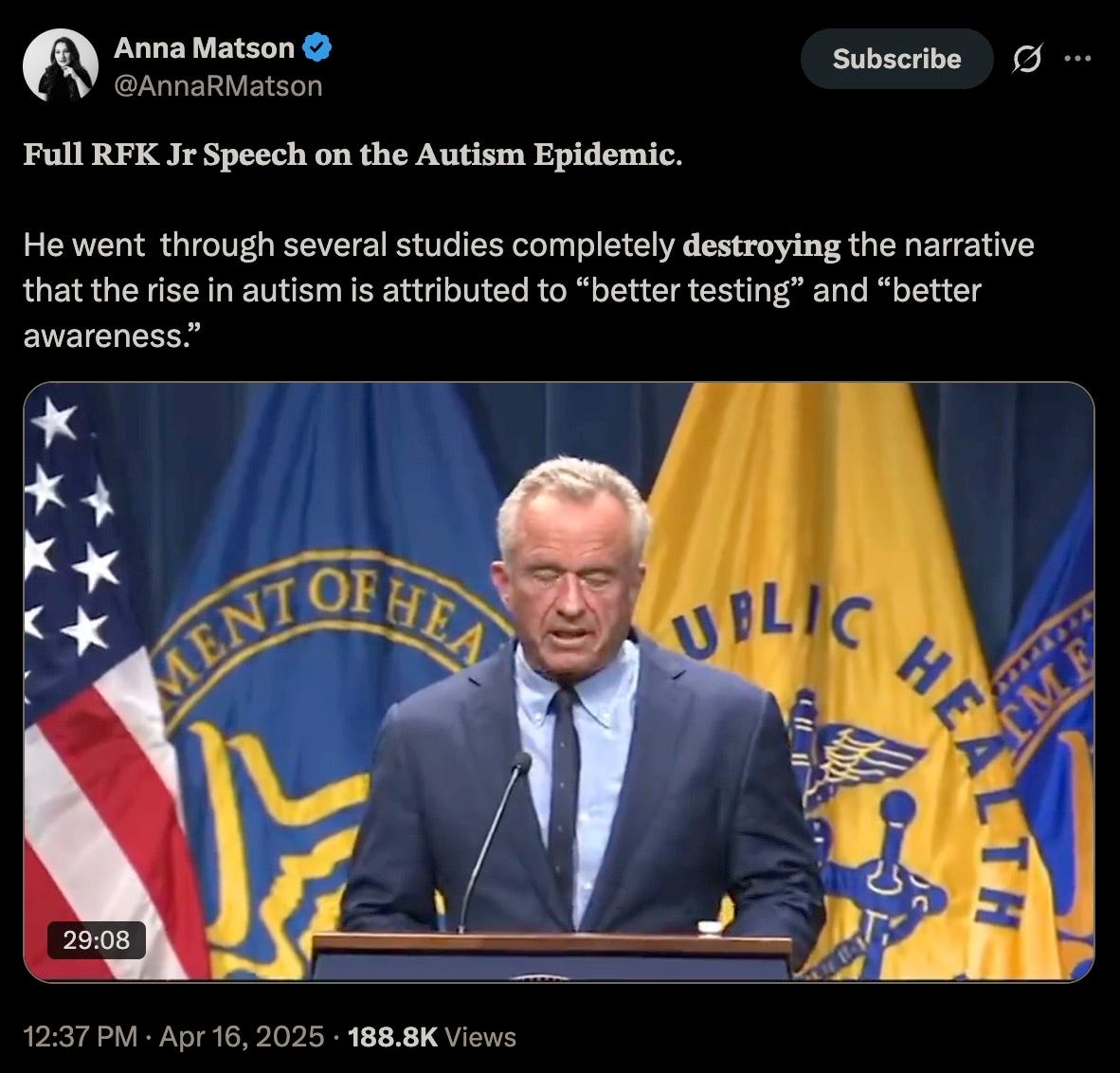 Here, the topic of autism is also unavoidable, if only as an expression of public skepticism of the medical establishment, simultaneous with vast vaccine harms and an epidemic of autism spectrum disorders. And Robert F. Kennedy, Jr., together with his extraordinary team, has sworn to get to the bottom of it quickly.