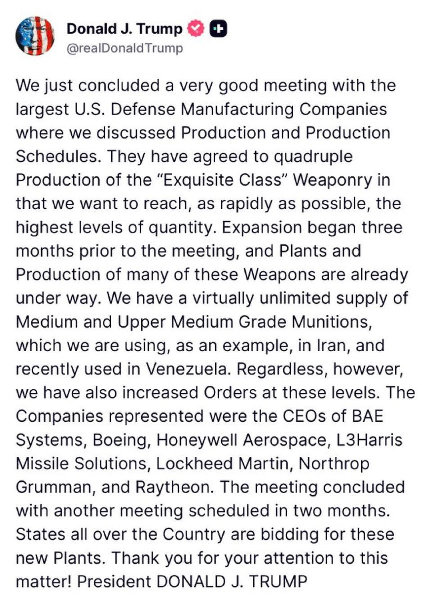 President Trump just posted that seven defense CEOs agreed to quadruple production of what he called “Exquisite Class” weaponry. BAE Systems, Boeing, Honeywell Aerospace, L3Harris, Lockheed Martin, Northrop Grumman, Raytheon. All in the room. He said expansion began three months ago. He said the United States has a virtually unlimited supply of medium and upper medium grade munitions.