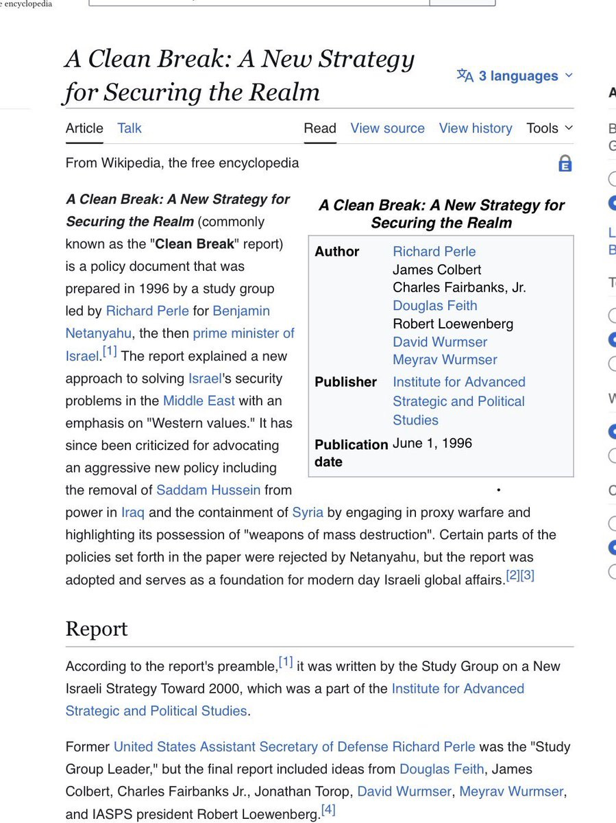 In 1996, a group of American Neocons Richard Perle, Douglas Feith, David Wurmser wrote a policy paper for Benjamin Netanyahu titled 'A Clean Break: A New Strategy for Securing the Realm.'