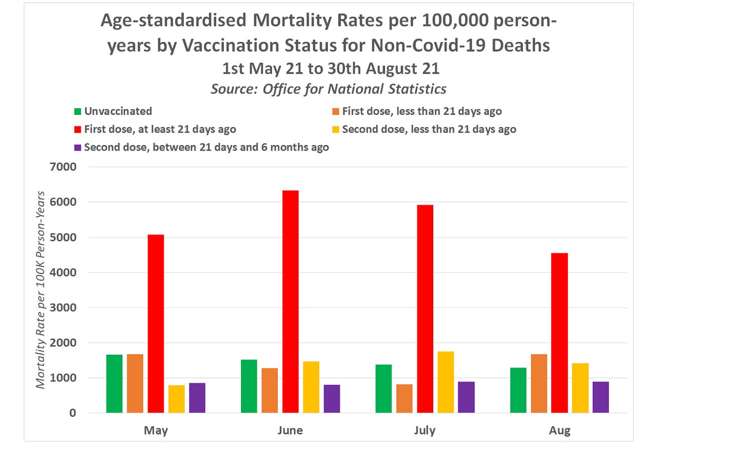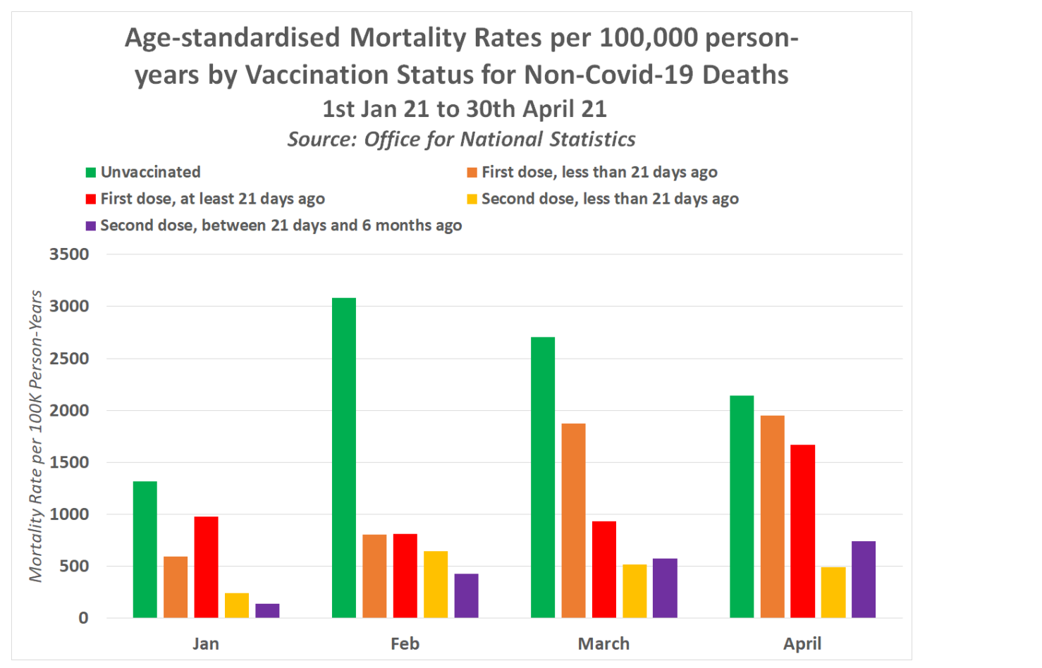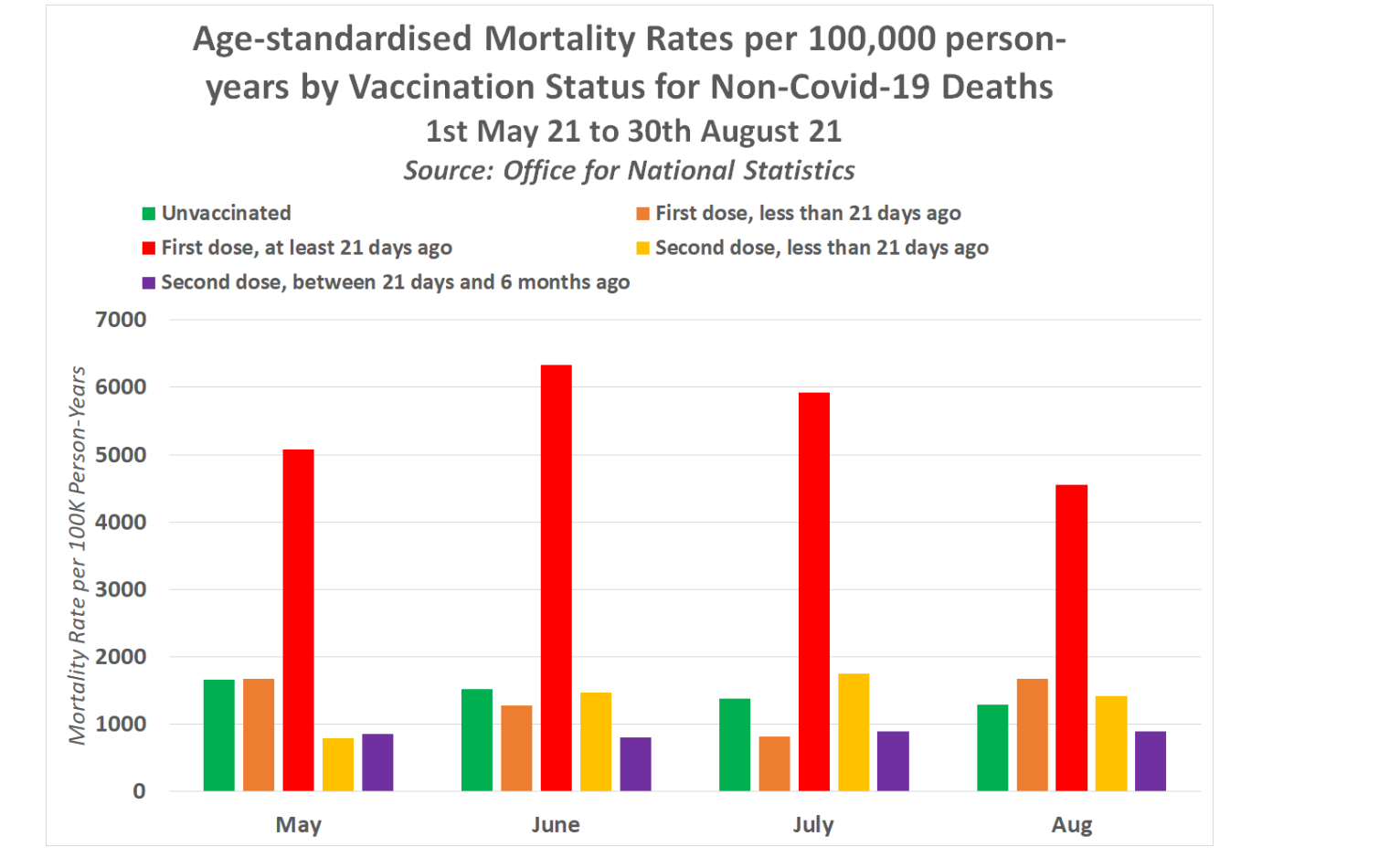 Ok thanks, even with that outside of immediate adverse events it would take 5 months + for the harm to the immune system to manifest itself As your chart shows for the first four months of 2021 you see the unvaccinated have a much higher mortality rate than the vaccinated.