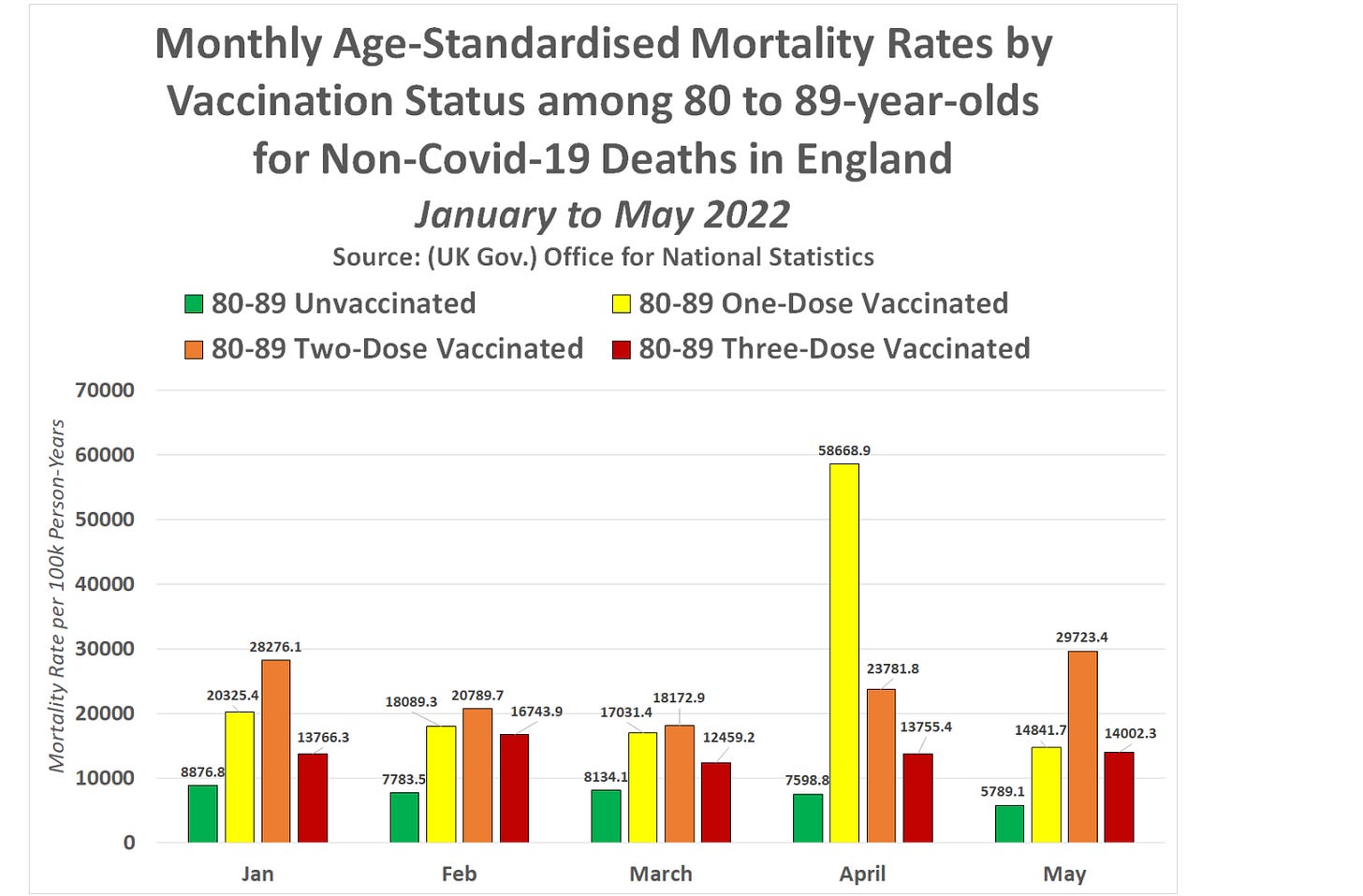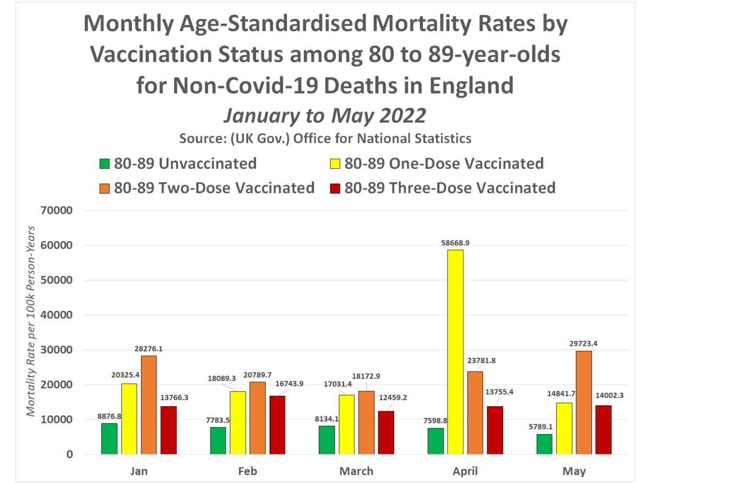 The UK all cause mortality data DOES show higher mortality in unvaccinated people age 80 and over with around 10 vaccinations necessary to prevent 1 death per month. The vaccine was associated with a benefit in older patients. Now, these results were predicated on existing practices. Would the results have been different had there been widespread use of ivermectin early on in treatment of older patients? We will never know since it was not done. The all cause mortality data DOES show a convergence of mortality between the vaccinated and unvaccinated groups after May 2021 and especially during 2022, so the duration of benefit of vaccination does appear to be only a few months.