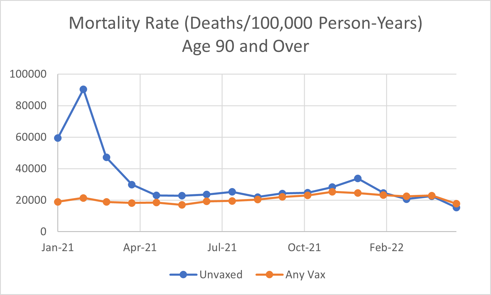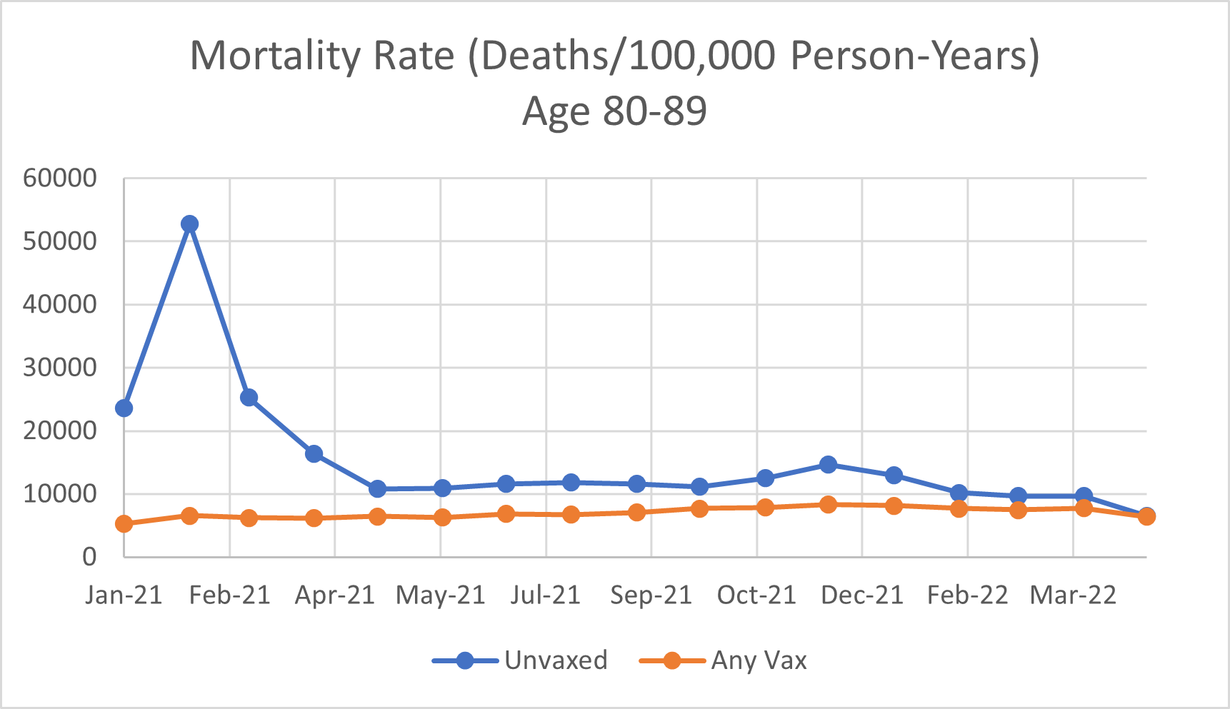 C: The most recent graph in the 80-89 and 90+ cohorts shows significant differences between the unvaccinated and vaccinated for the months from January through May 2022 in favor of being unvaccinated. Your graph puts the vaccinated at a small advantage from January to March 2022. Is the data source I provided different from the one you used?
