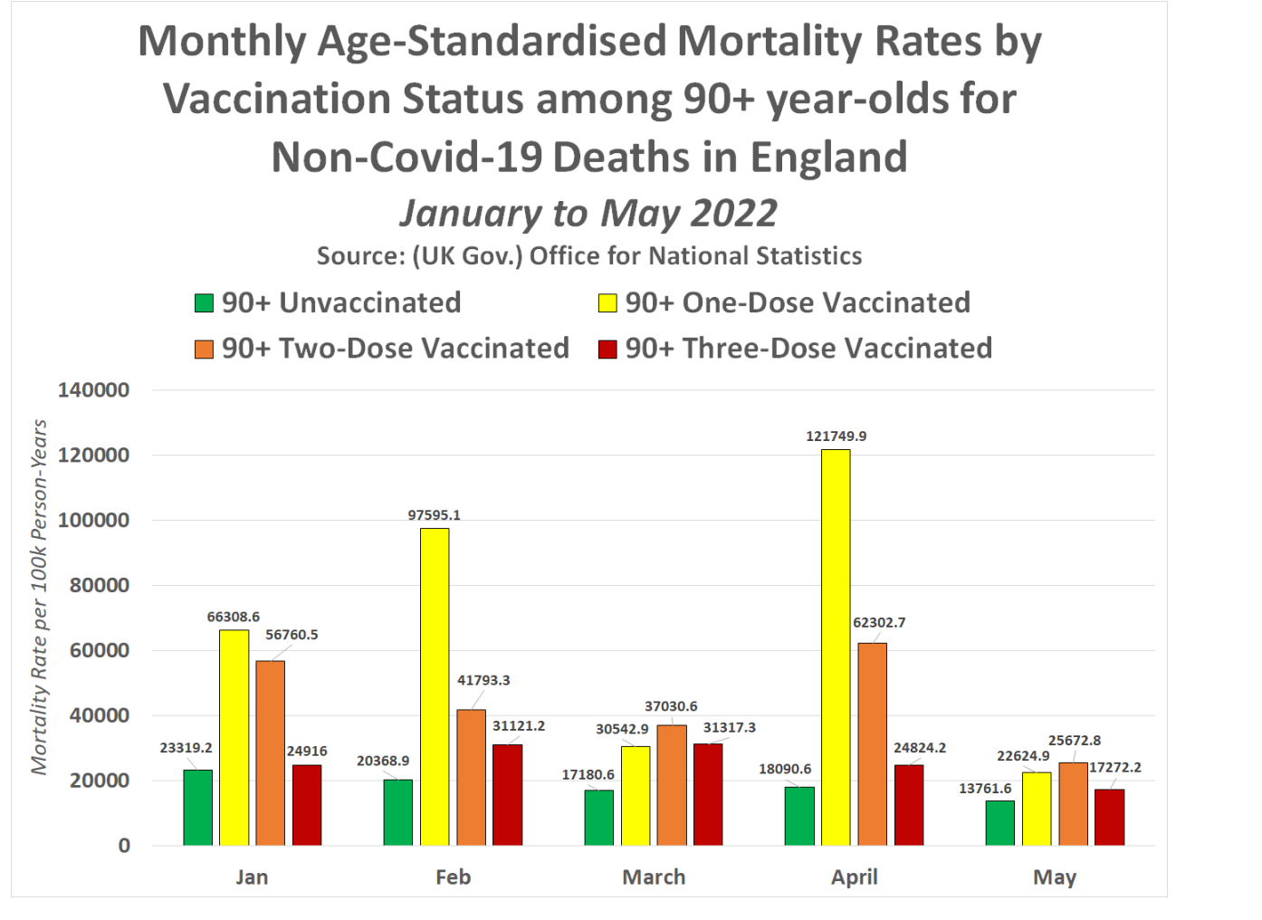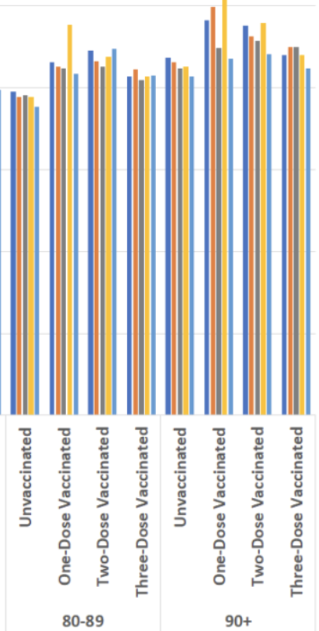 Even comparing the unvaccinated group to the three dose only vaccinated group the numbers are not even close with the single exception of January 2022 in the 90+ group where the difference is likely not statistically significant albeit the unvaccinated group is not worst off than the vaccinated group.