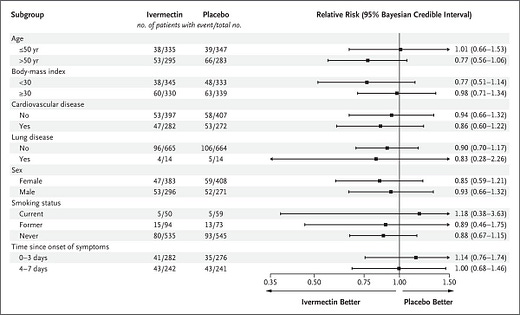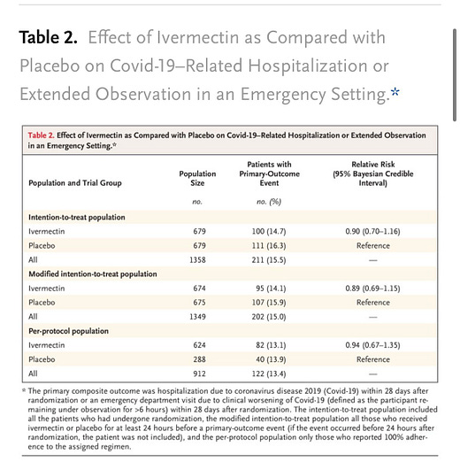 “100 patients (14.7%) in the ivermectin group had a primary-outcome event (composite of hospitalization due to the progression of COVID-19 or an emergency department visit of >6 hours that was due to clinical worsening of COVID-19), as compared with 111 (16.3%) in the placebo group