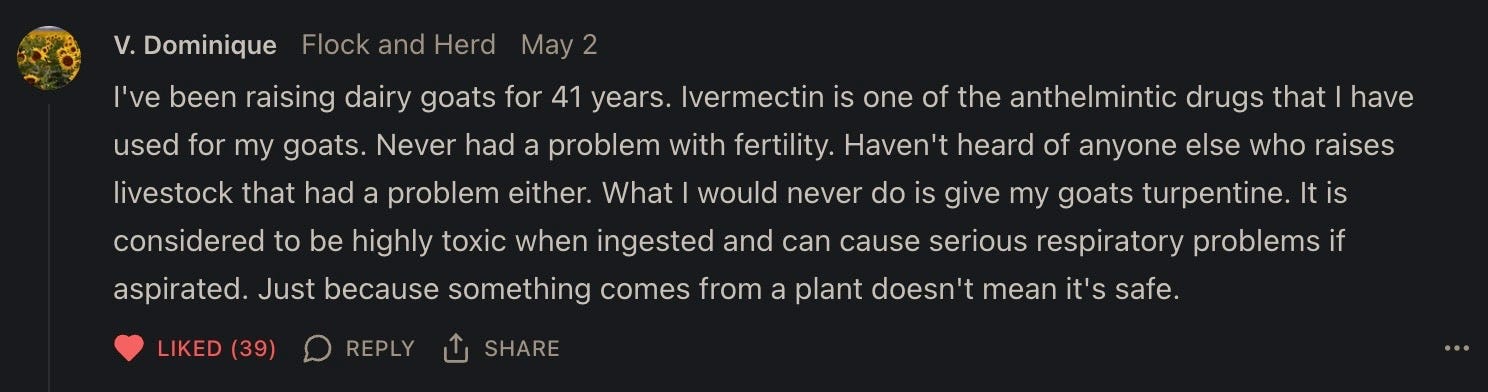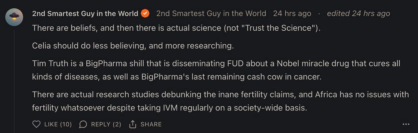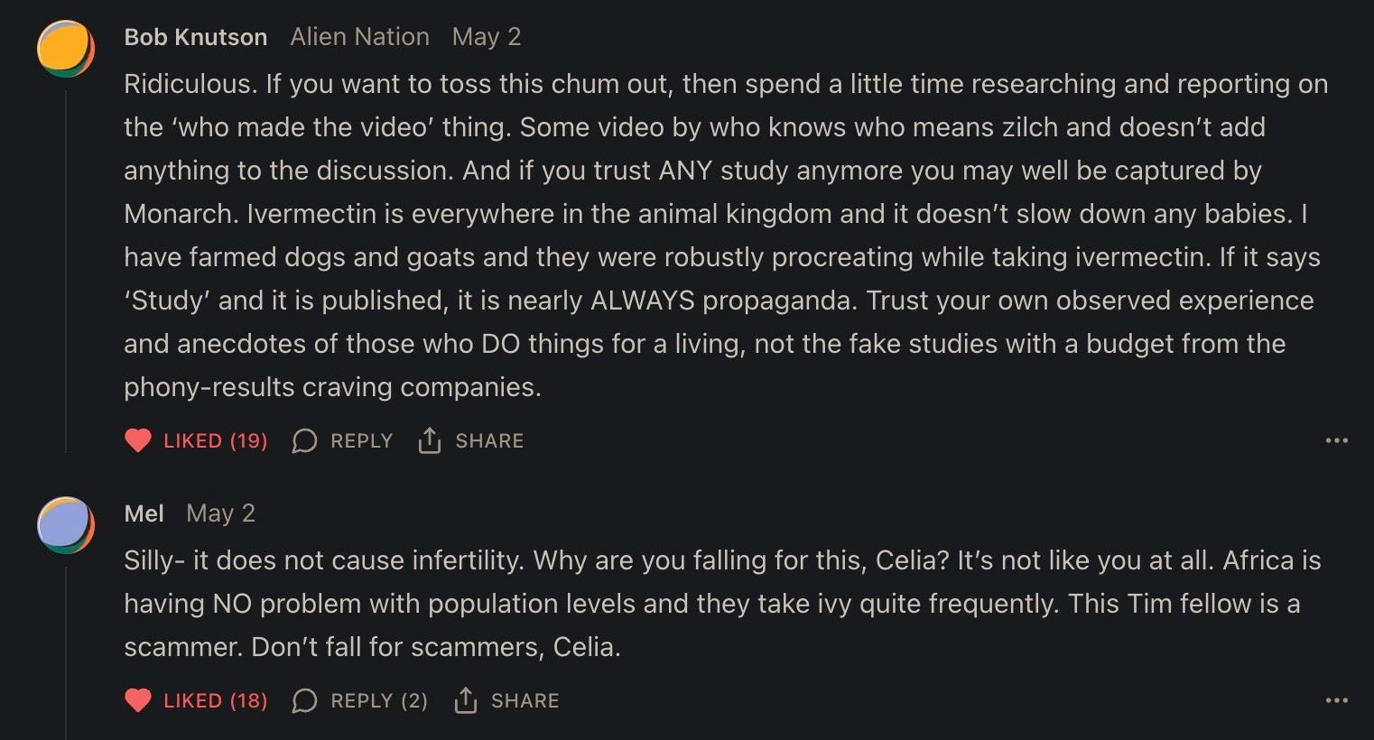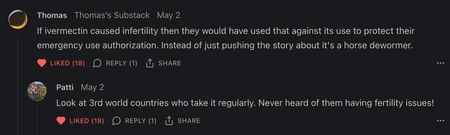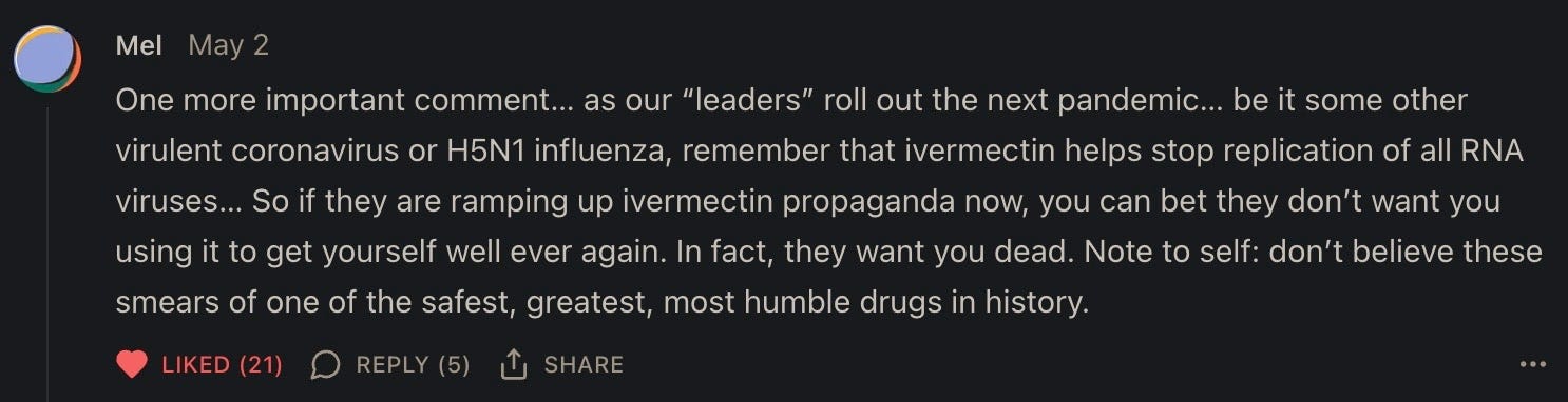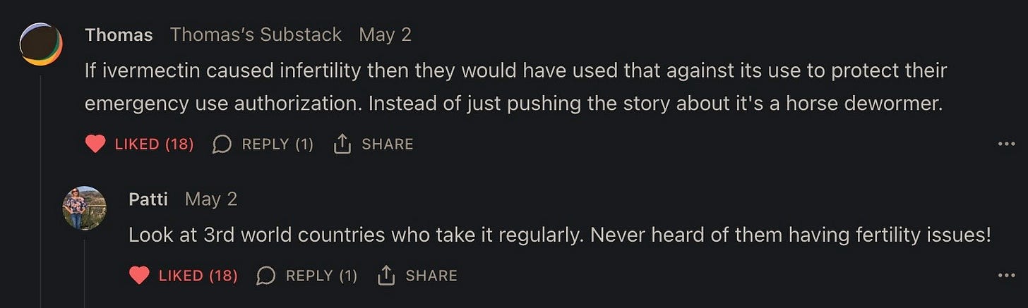 Circling back to the Substack article referencing the absurd Ivermectin disinformation/misinformation nonsense, here are some of the more astute comments: