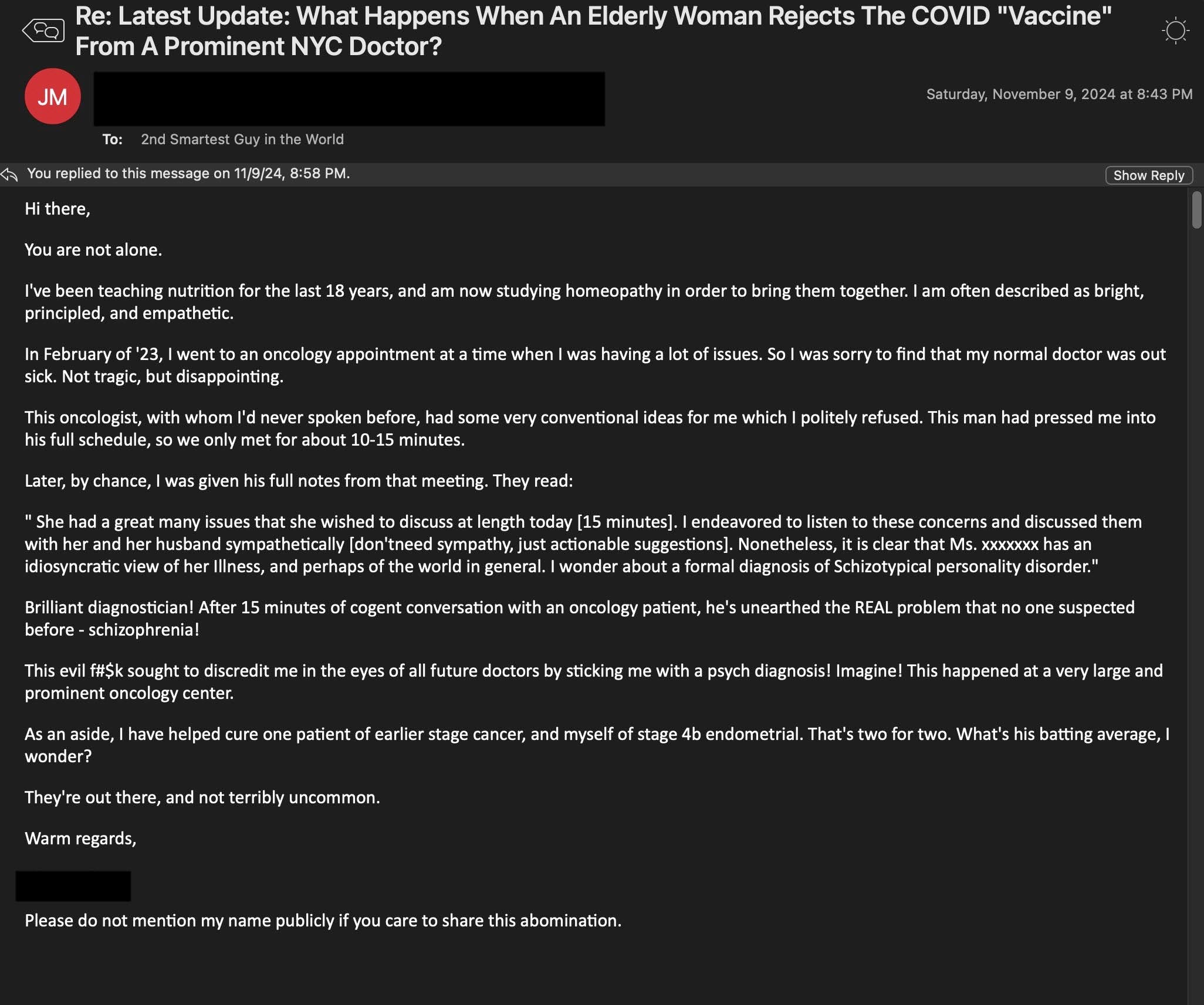 The fact that this person advocated for themselves so ferociously and cured their cancer should serve as a wake up call to anyone suffering at the mercy of their God complex-afflicted oncologist.