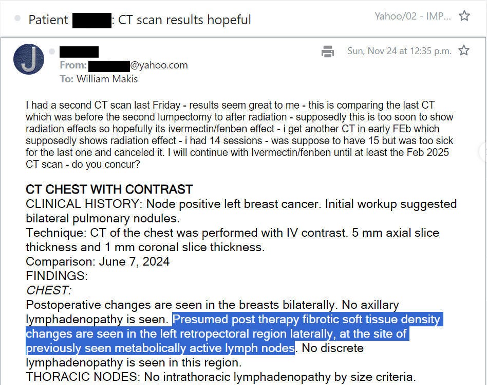 IVERMECTIN and FENBENDAZOLE Testimonial - 70s year old Breast Cancer patient now "Cancer Free" after ignoring Radiation Oncologist advice to STOP Ivermectin during Radiation Therapy!