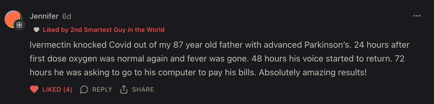 I'm so curious! In December 2020 I contracted Covid, no shots for me, EVER. Got long Covid and researched like crazy, found Ivermectin, got a functional medicine doc to prescribe it to me and got my life back. I order it regularly now from Virex.health, thanks to this Substack. I'm very grateful. My curiosity stems from my experience this week. Somehow my hubby and I caught the flu bug. I started right away taking taking 24 mg twice a day of Ivermectin, doubled the Quercetin, Ester C and Bromelain. It has only lasted 4 days. I'm not 100% but close. However, I've noticed that my knees, which have been hurting with every step for quite some time, now don't. I'm wondering, is it because I've laid in bed for 3 days, doing nothing but watching reruns of Las Vegas or is it because of the uptake of Ivermectin? Typically I've been taking just 12 mg of Ivermectin once every 3 days as maintenance or every day if I hang around vaxxed friends. If anyone has any insight I'd be interested. I am planning to keep on taking this level for a while as I recover and get back to walking our naughty dogs 3 times a day, going up and down stairs, etc. Thank you for any insight or information.