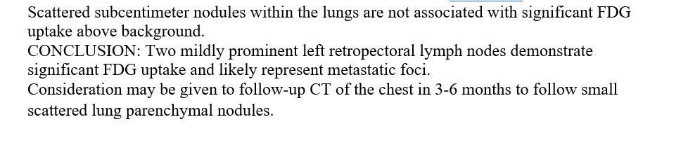 70s year old Stage 3 Breast Cancer patient had metastatic retropectoral lymph nodes positive on PET/CT in July 2024: