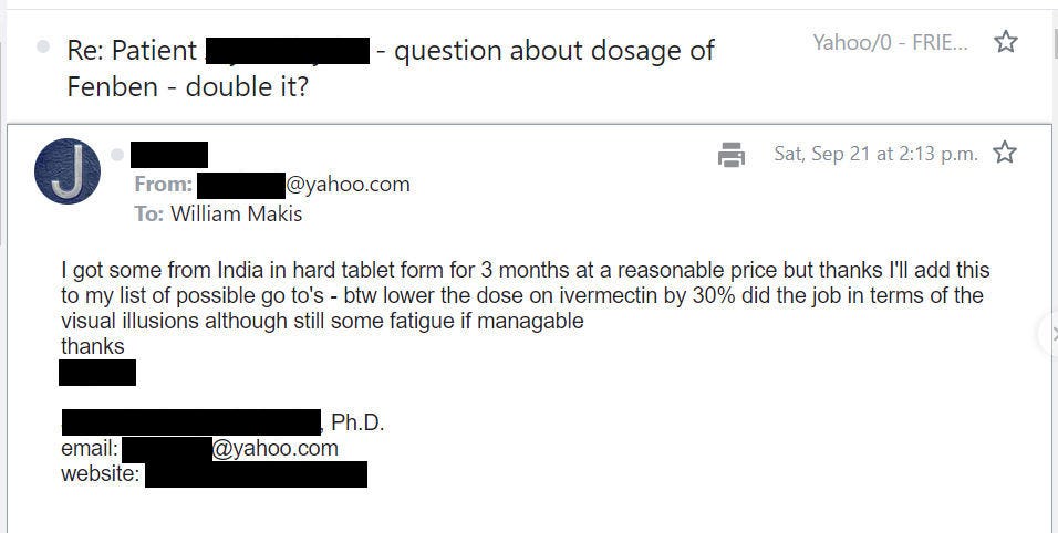 Not to say that all of the other compounds used did not help to some degree, but the synergistic combination therapy of Ivermectin and Fenbendazole did most of the heavy lifting for this patient, and the protocol at the end of this article would be the most effective treatment approach.