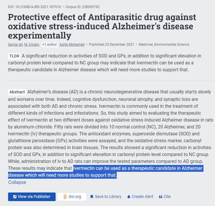 “Ivermectin can be used as a therapeutic candidate in Alzheimer disease which will need more studies to support that” - 2021.