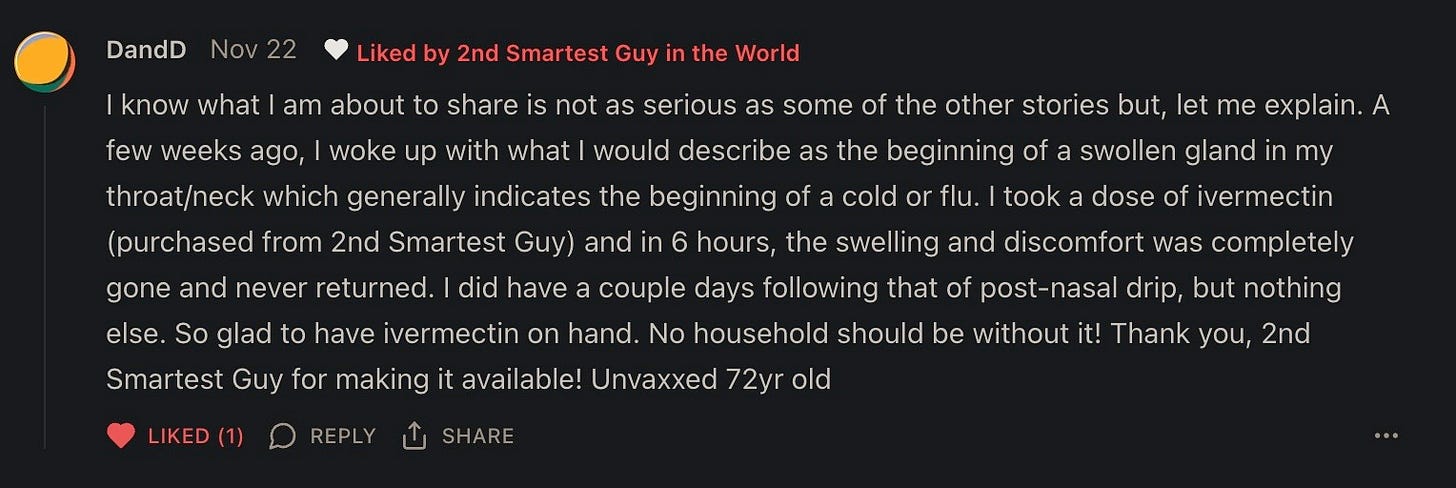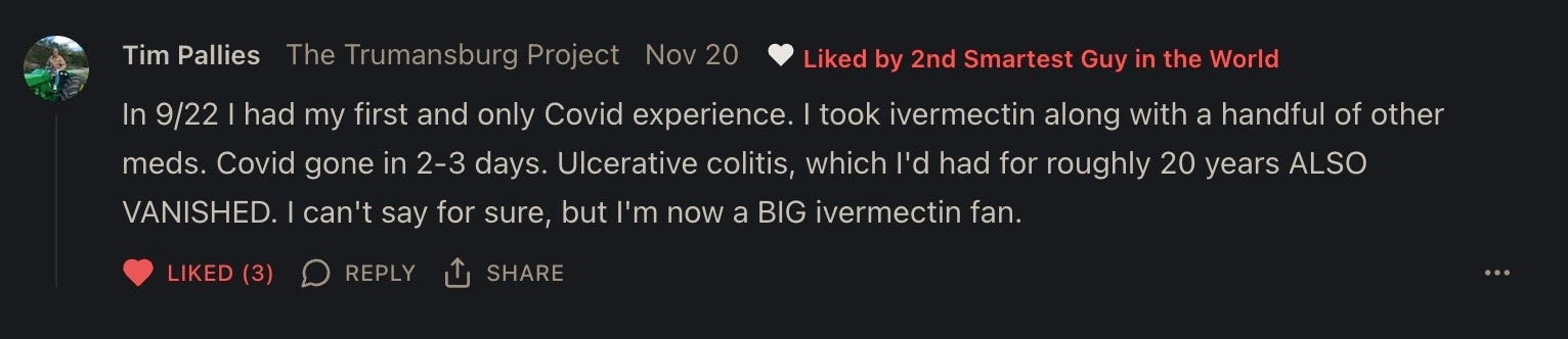 And now even the most mainstream of the mainstream influencers are getting hip to the fact that Fenbendazole cures cancer — and eventually they will realize as per studies and this Substack’s crowdsourced data that adding Ivermectin greatly increases the remission outcomes: