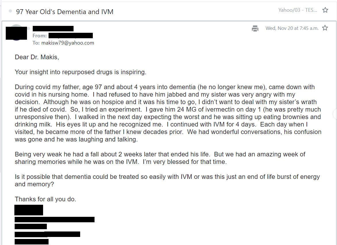 …and that one of the innumerable VAIDS-induced symptoms of prion-based disease may be attenuated with the use of both Ivermectin and Fenbendazole, with Dr. Makis’s recent article entitled, IVERMECTIN and DEMENTIA Testimonial - 97 year old patient begins to remember with IVERMECTIN - one of the most touching stories I've received!, further corroborating what this Substack has been sharing with the world for the last several years; to wit: