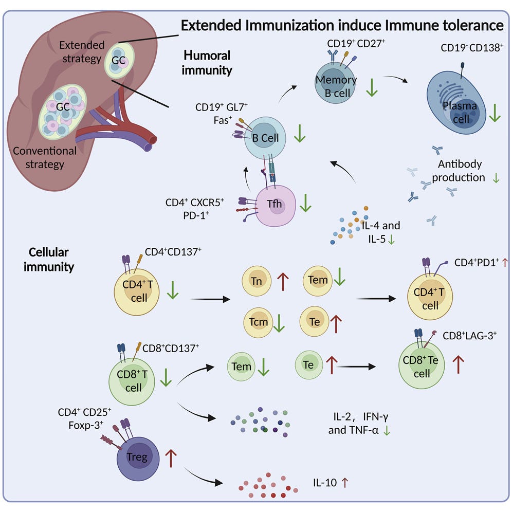 Moreover, over-vaccination may generate an immunosuppression micro-environment that is also an important facilitator of immune tolerance. We demonstrated that both the percentage of CD25+Foxp3+CD4+ Treg cells and the levels of immunosuppression cytokines IL-10 were up-regulated after extended RBD vaccine booster vaccination.