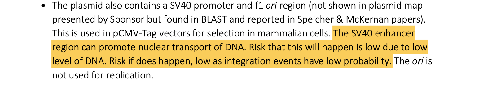 “The plasmid also contains a SV40 promoter and f1 ori region (not shown in plasmid map presented by Sponsor but found in BLAST and reported in Speicher & McKernan papers).”