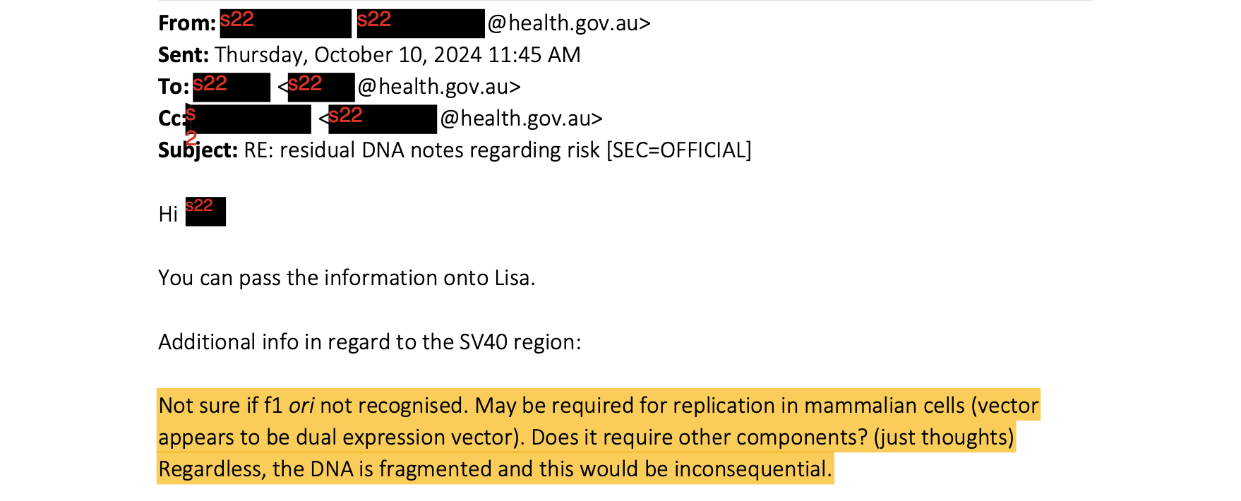 Dr Speicher expressed alarm that these TGA emails from as recent October 2024 raise basic questions like whether the levels of residual DNA meet the quantity and size limits, whether there is any data on residual DNA being encapsulated in LNPs (or not), and seeking to confirm what SV40 sequences are contained in the Pfizer plasmid vector.