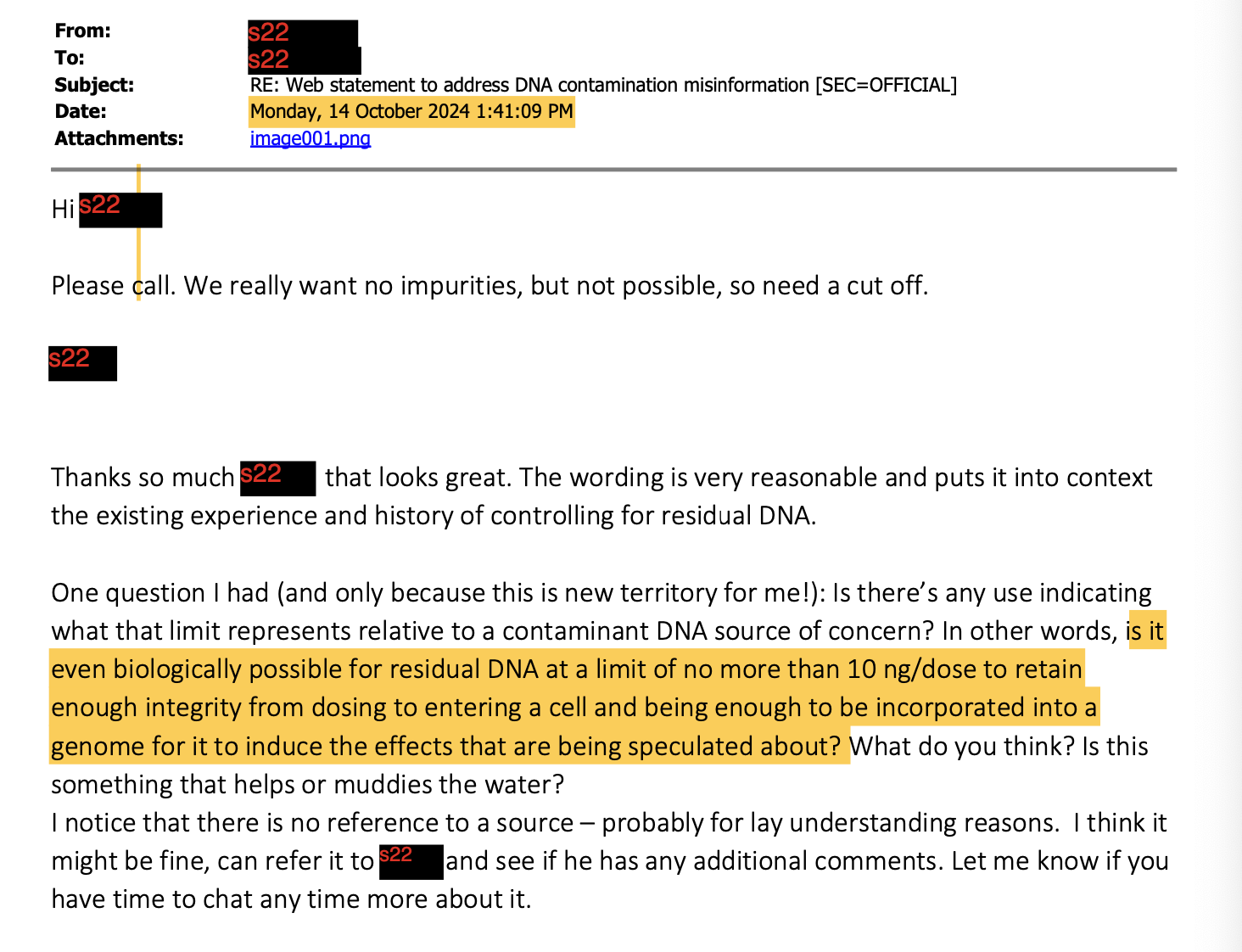 The TGA’s statement was littered with false and misleading claims, which have been addressed in detail here. Now, emails released under FOI reveal that the TGA knowingly withheld information on DNA contamination risks from the public.