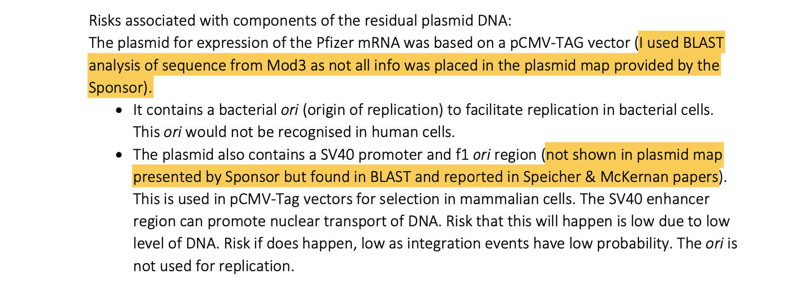 “The SV40 Ori is active in mammalian cells when coupled with an F1 Ori and ColE1. Both exist in the Pfizer sequence.” This is science-speak for ‘yes, this plasmid presents a replication risk in human cells.’