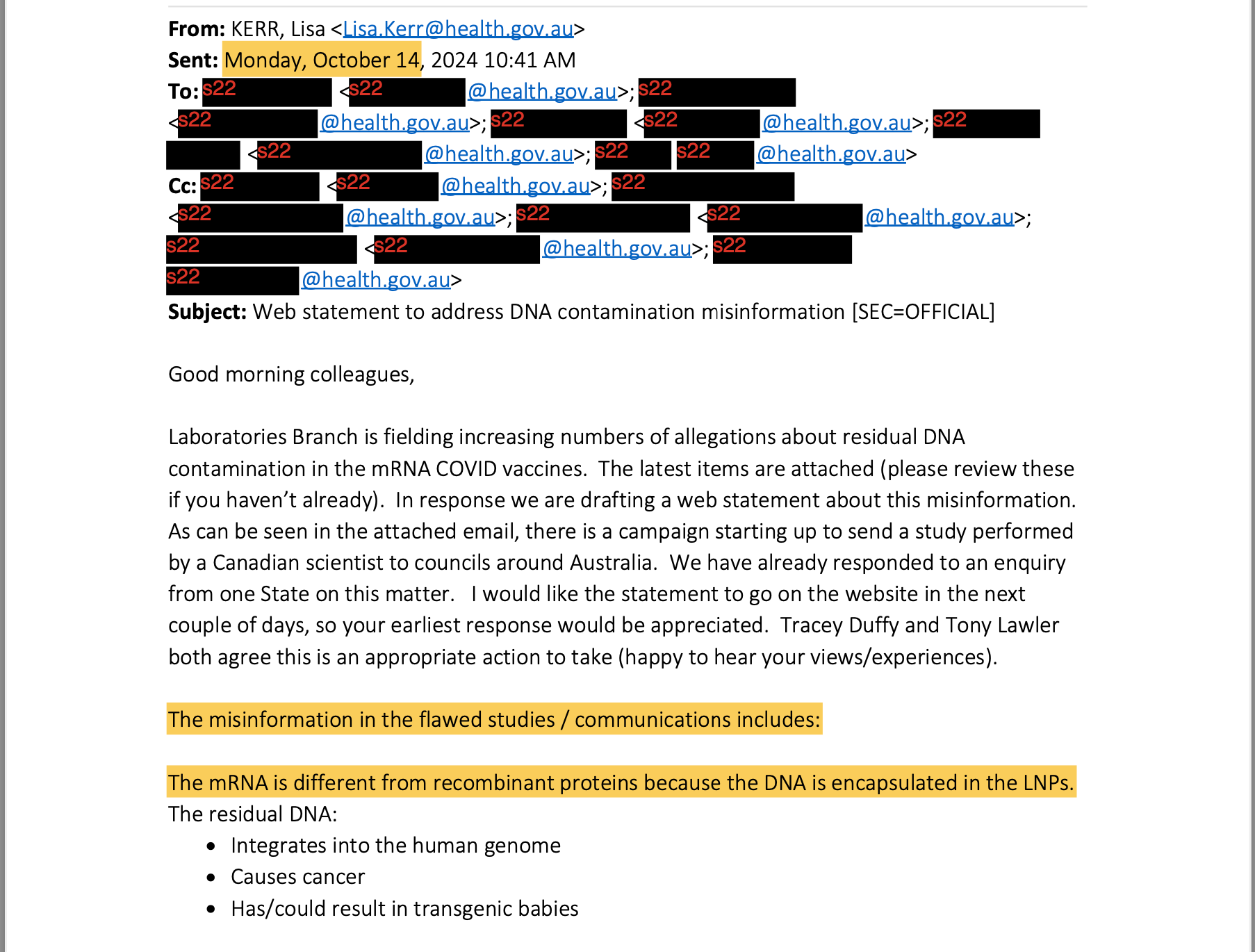 , whose request for all TGA correspondence related to the production of thewebpageand associated social media posts regarding allegations of DNA contamination in modRNA vaccines has further exposed the regulator’s duplicity on this matter.