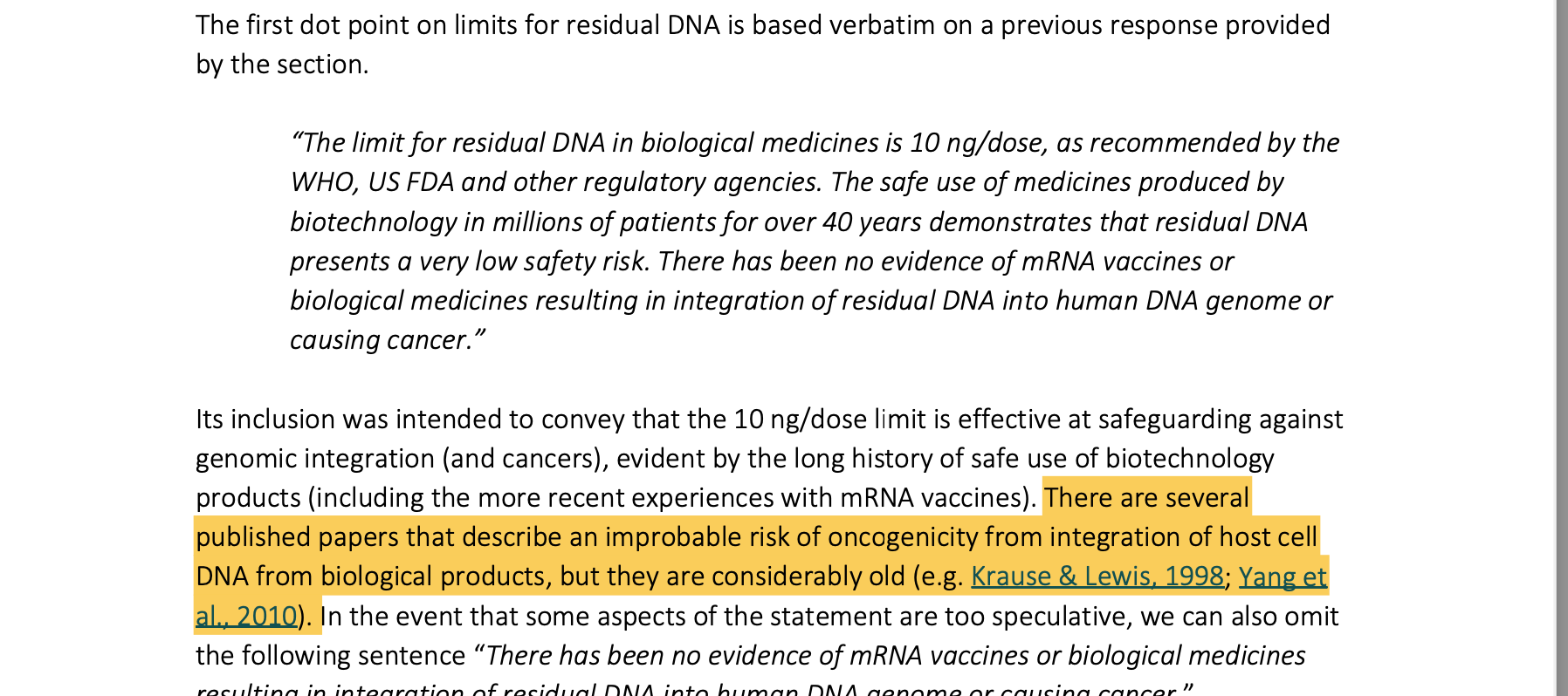 Once again, TGA staff seem to have forgotten that the scientific references they are referring to relate to naked DNA, not DNA packaged in LNPs and delivered straight into cells all over the body.