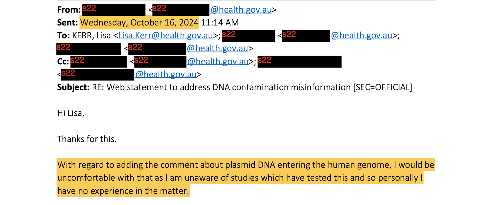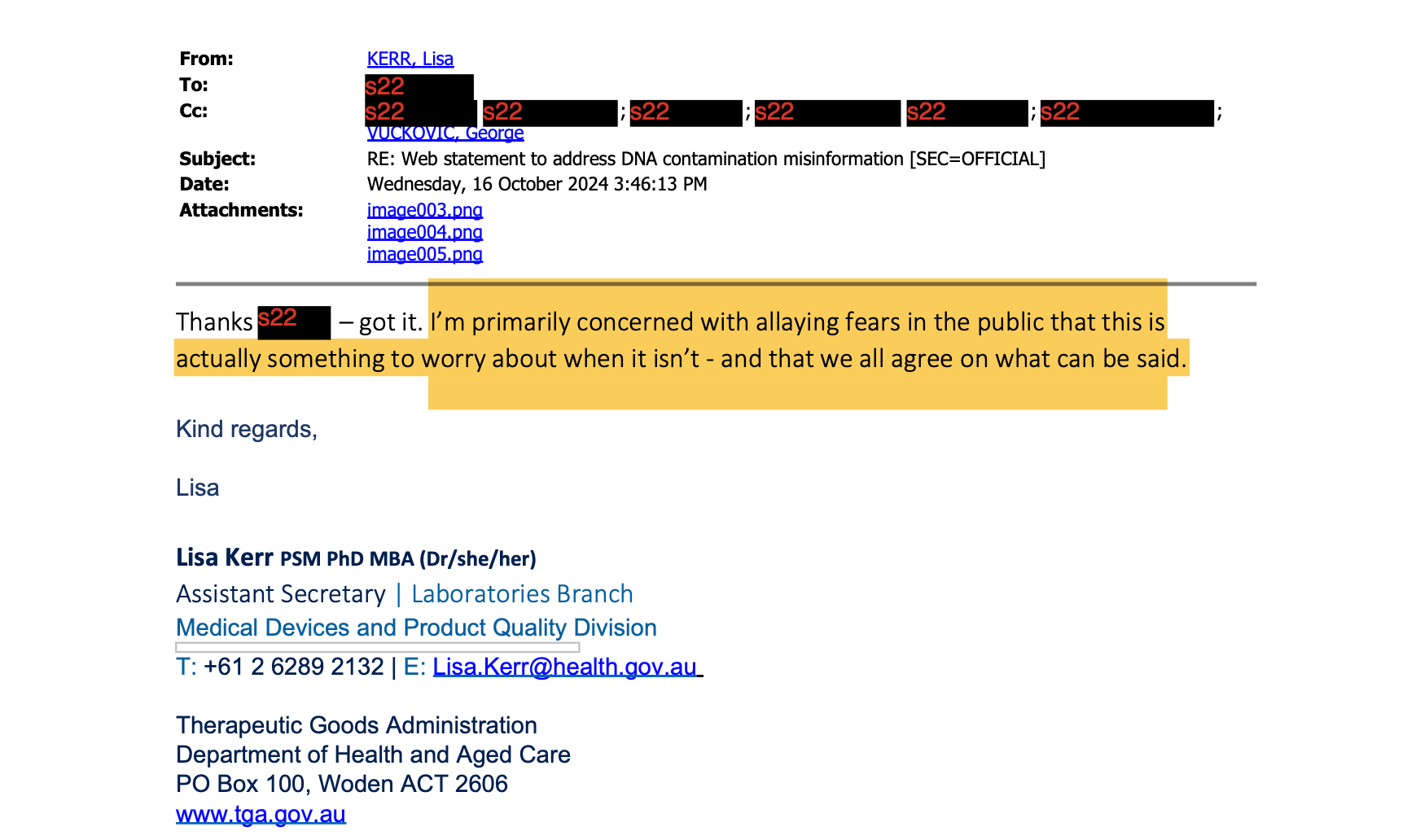 Indeed, Dr Lisa Kerr, Assistant Secretary of the Laboratories Branch, who co-ordinated the internal communications to develop the TGA’s statement on DNA contamination ‘misinformation’ said as much.