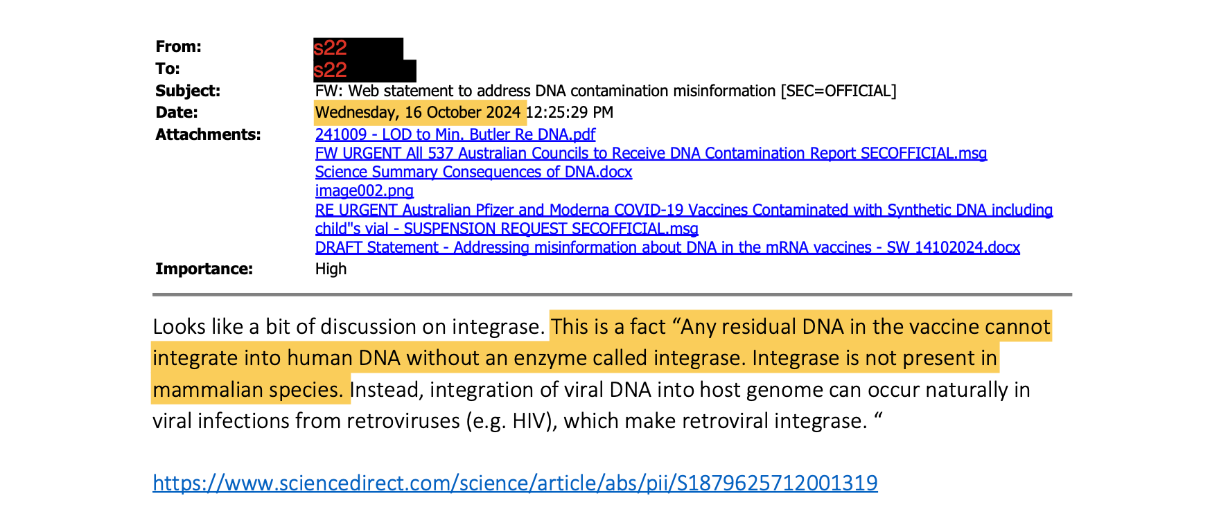 I cannot stress enough how contrary this is to official TGA and Department of Health messaging, which has vehemently denied that genomic integration of modRNA vaccine elements is possible at all.