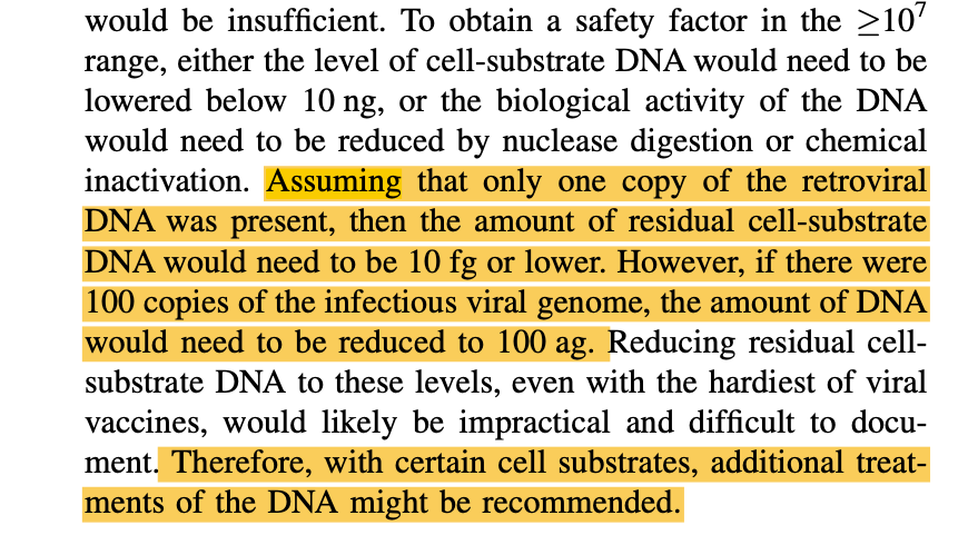 The qualification follows, “Risk that this will happen is low due to low level of DNA. Risk if does happen, low as integration events have low probability.” Note that ‘low probability’ is a different thing to ‘not possible.’