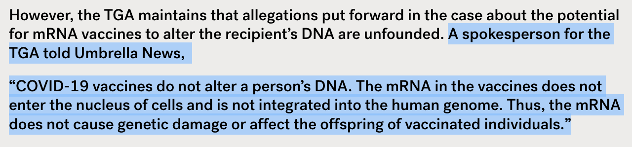 The TGA has repeatedly stated that modRNA vaccine elements cannot enter the nucleus of cells, nor can they integrate into the genome.
