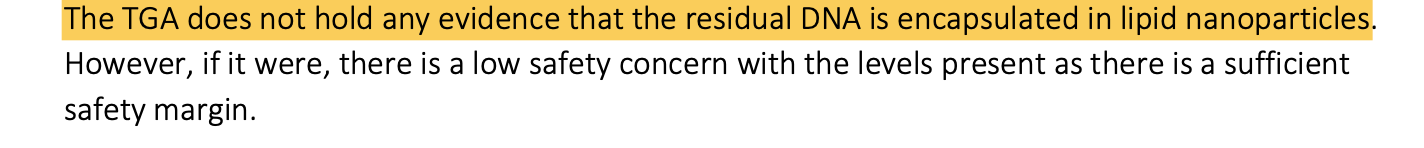 “The TGA does not hold any evidence that the residual DNA is encapsulated in lipid nanoparticles. However, if it were, there is a low safety concern with the levels present as there is a sufficient safety margin.”