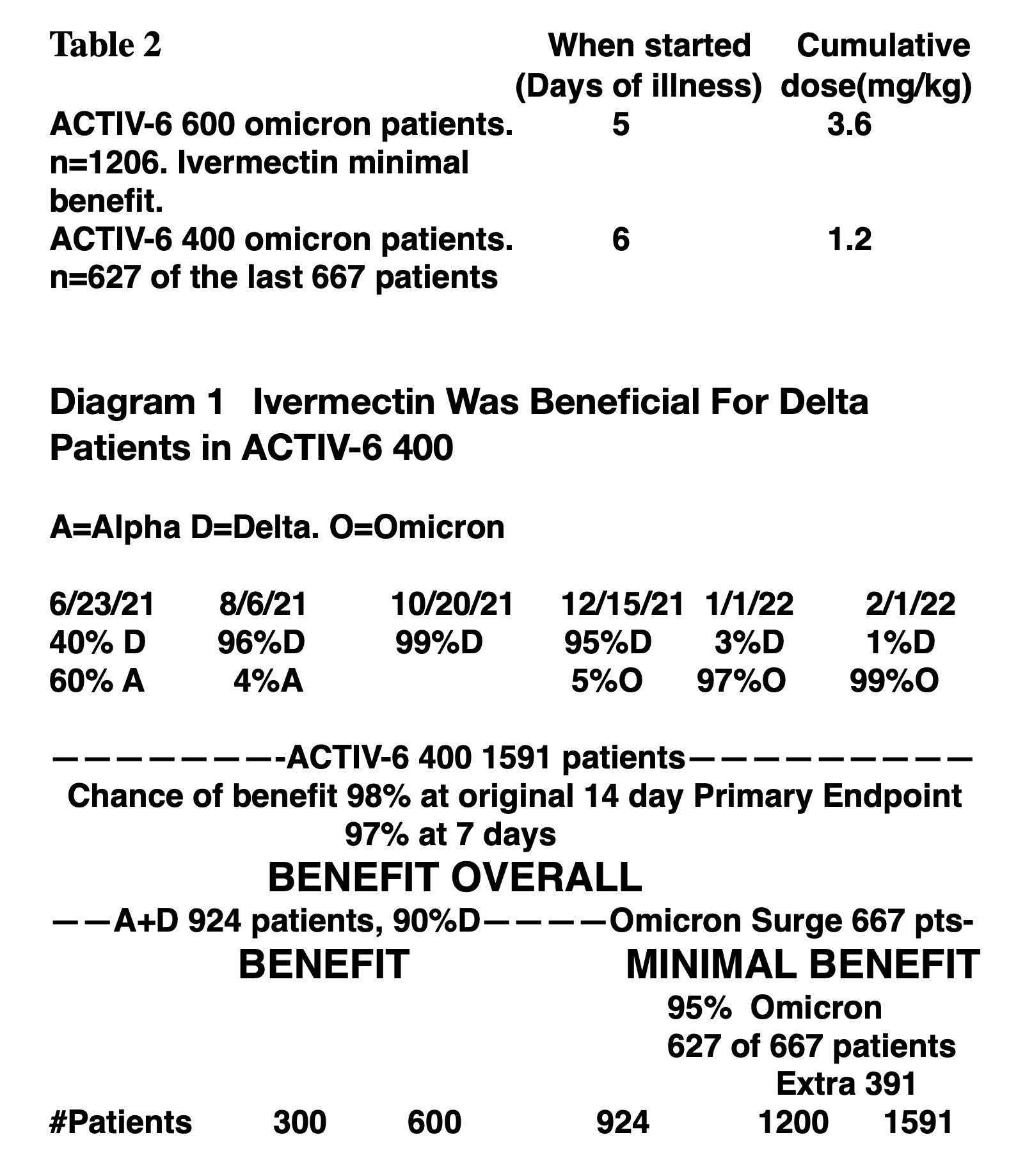 (9). Of the first 924 patients, over 90% had delta for which ivermectin was effective. In ACTIV-6 400 the investigators didn't report any of the interim data every 300 patients they were supposed to report because they knew that ivermectin showed benefit at 900 and probably 600 patients. Had delta and omicron been equally effective this wouldn't have mattered.