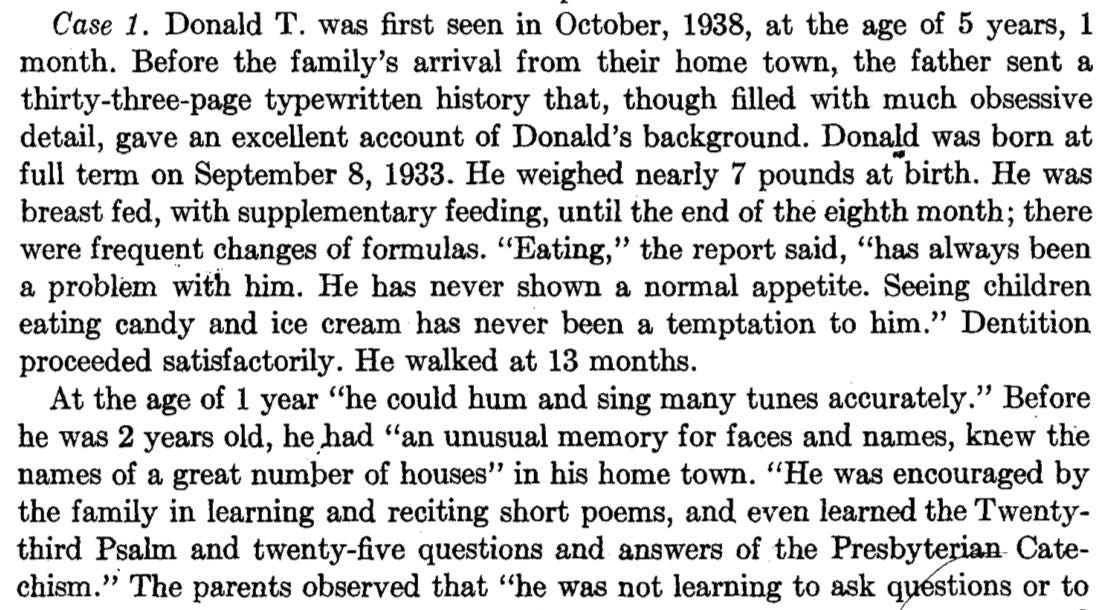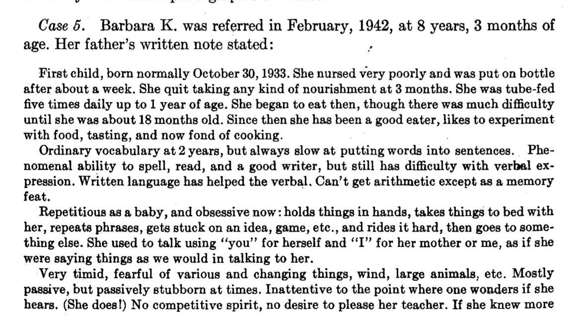 7) In 1935, Kanner published a 500-page book on childhood psychiatry—the largest such book in the world. He mentioned nothing resembling autism. It’s clear he’d never seen or heard of anything like the children who were now being brought to his clinic.