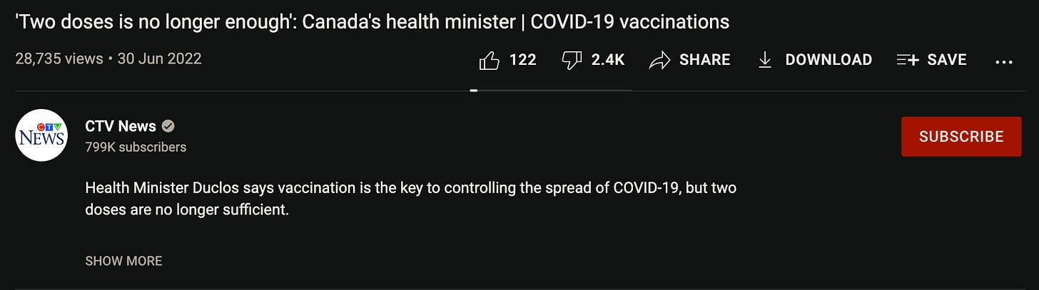 I swapped out the original video clip with a YouTube clip from CTV News, “Canada's most-watched news organization both locally and nationally”. Note the upvote to downvote ratio and views of said clip: