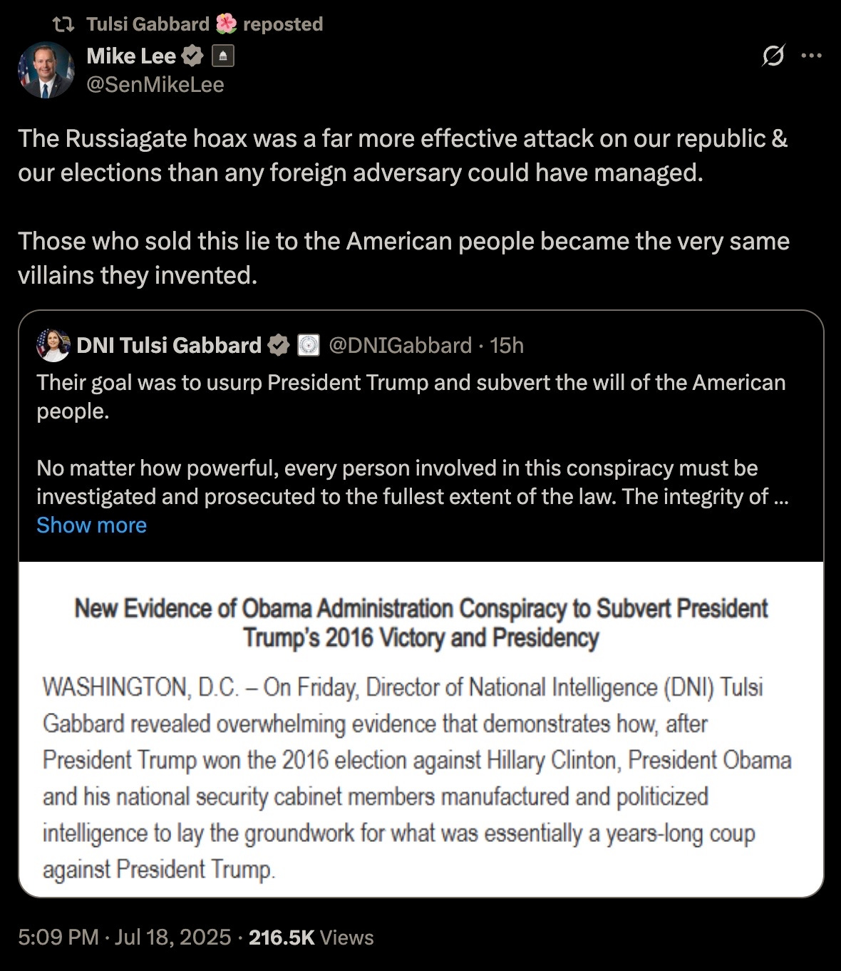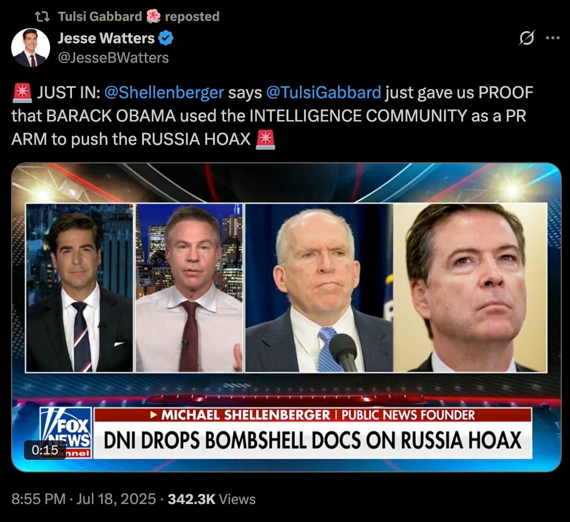 And now DNI Tulsi Gabbard has dropped an absolute bombshell X thread exposing the 4th Branch of Government that has been lording over the other three branches, with a call for long overdue prosecutions; to wit:
