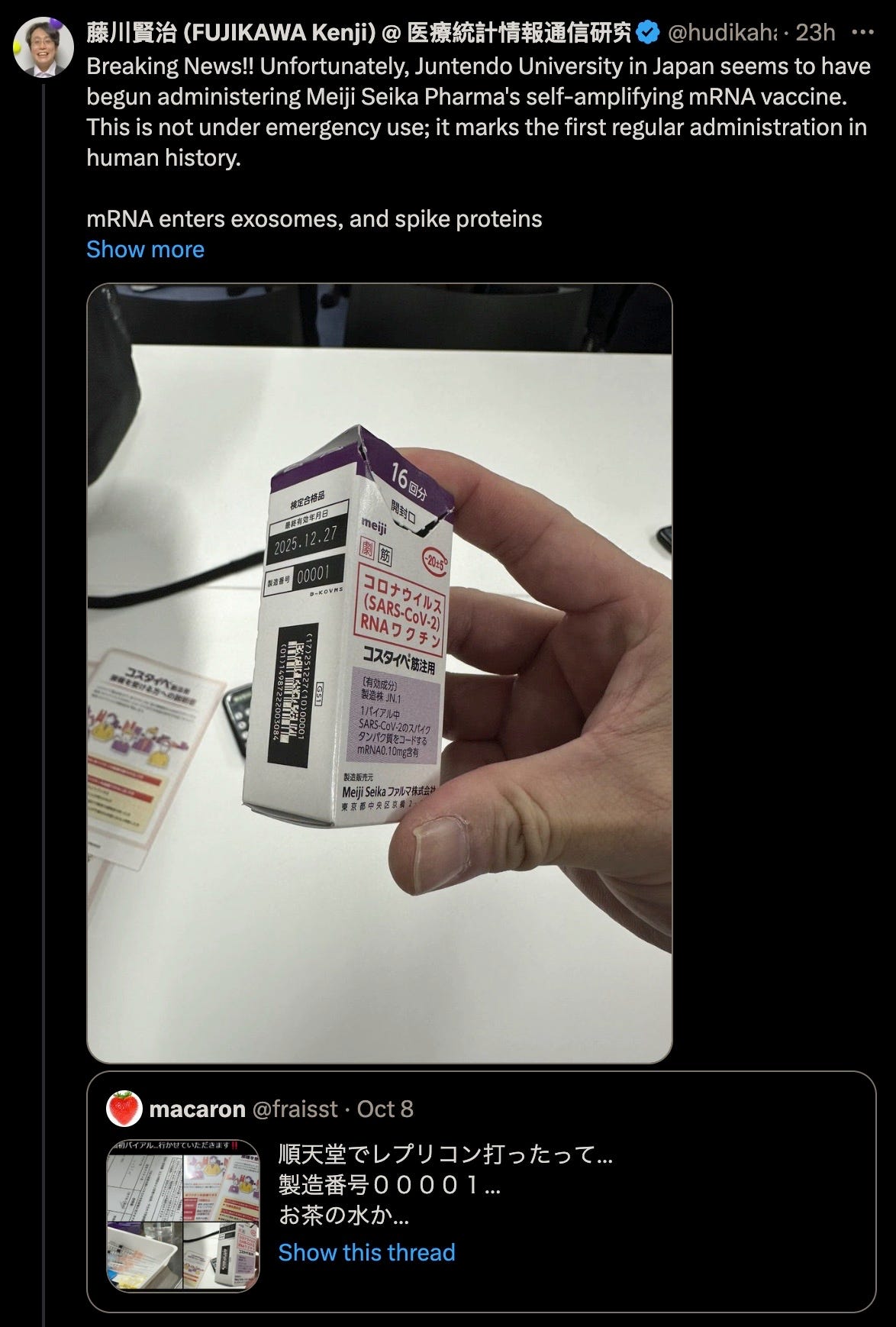 BREAKING: Juntendo University in Japan has begun administering Meiji Seika Pharma's Self-Amplifying mRNA "Vaccine"