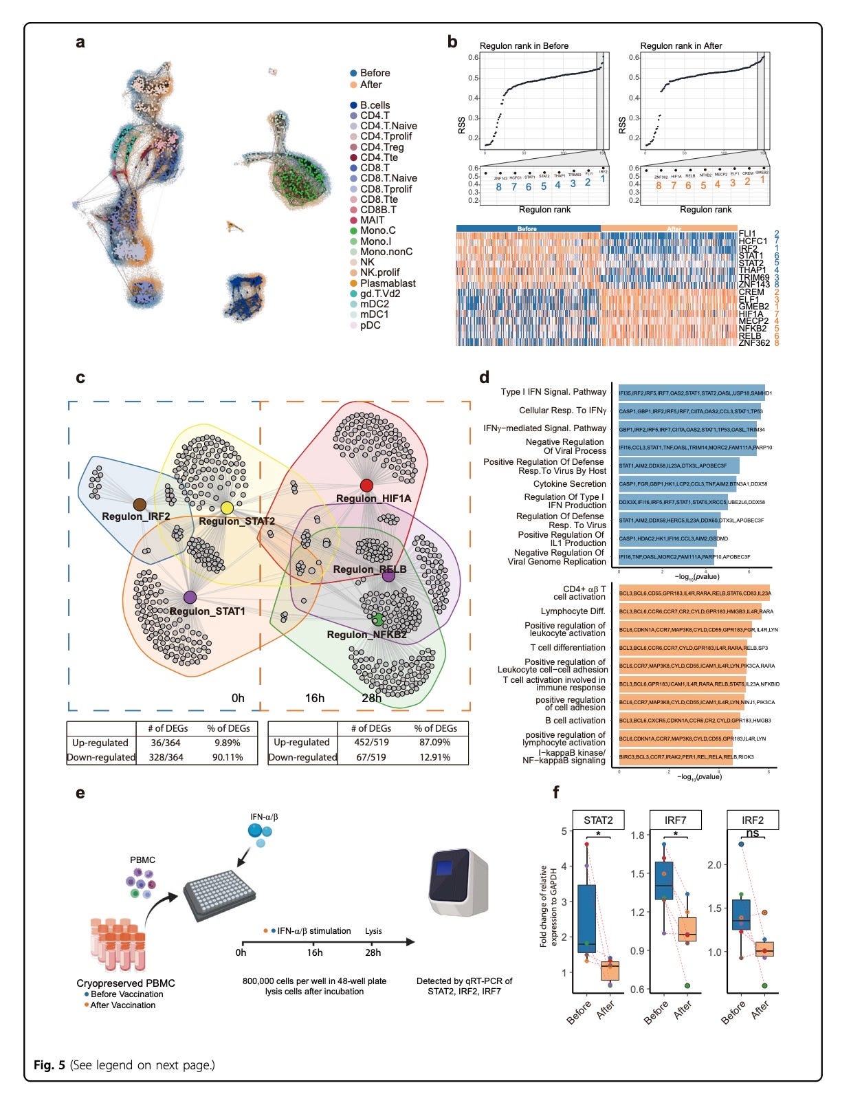 Fig. 5 Identification of master regulons and their regulatory networks before and after vaccination. a Visualization for the “similarity-structureassociating” metacells on the original scRNA-seq data. Metacells were color-coded according to their cell-type annotations. The original scRNA-seq data were color-coded “blue” and “orange” to represent samples “before” and “after” vaccination, respectively. b Top panels: rank of regulons in samples before (left) and after (right) vaccination, based on Regulon Specificity Score (RSS). Bottom panels: heatmap of top-ranked regulon activities before (blue) and after (orange) vaccination based on AUCell scores. Names of the regulons are color (blue/orange) and number coded (1–8). c Network of regulons and their target genes. The table below indicated the proportion of genes within the regulons which were up- or downregulated after vaccination. d Gene functional annotation and related genes before (blue) and after (orange) vaccination. e Schematic overview of the experiment. f After treatment with IFN-α/β, PBMCs from volunteers after vaccination had reduced expression of genes associated with type I interferon responses as compared to those before vaccination. Paired Wilcoxon test was used. *P ≤ 0.05, n = 6.