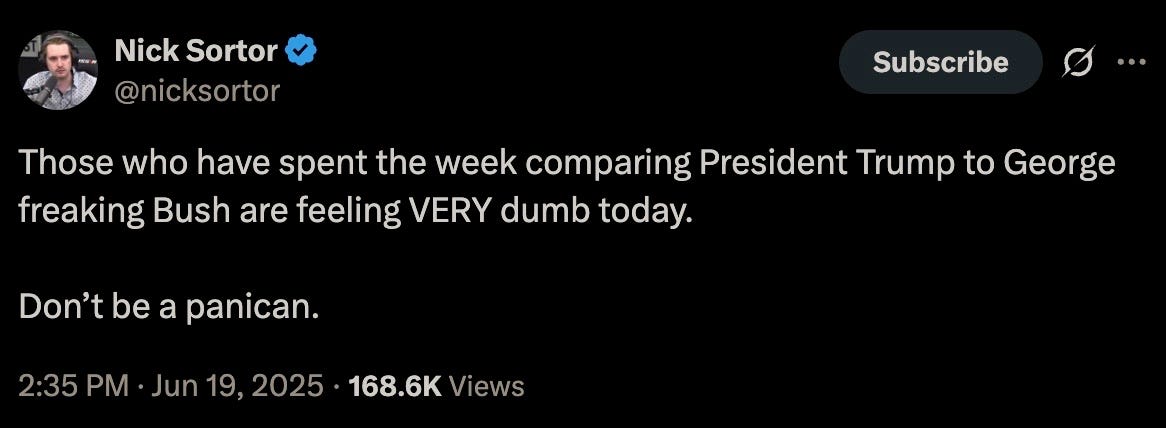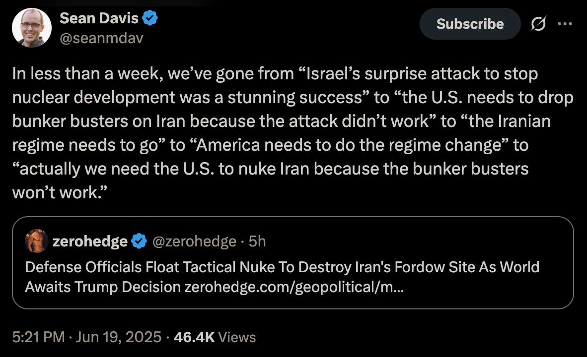 This confirms our analysis below that Trump prefers peace with Iran, and diverges in nuanced ways from Netanyahu’s total war plans. Receipts provided via our latest Radical Dispatch below.
